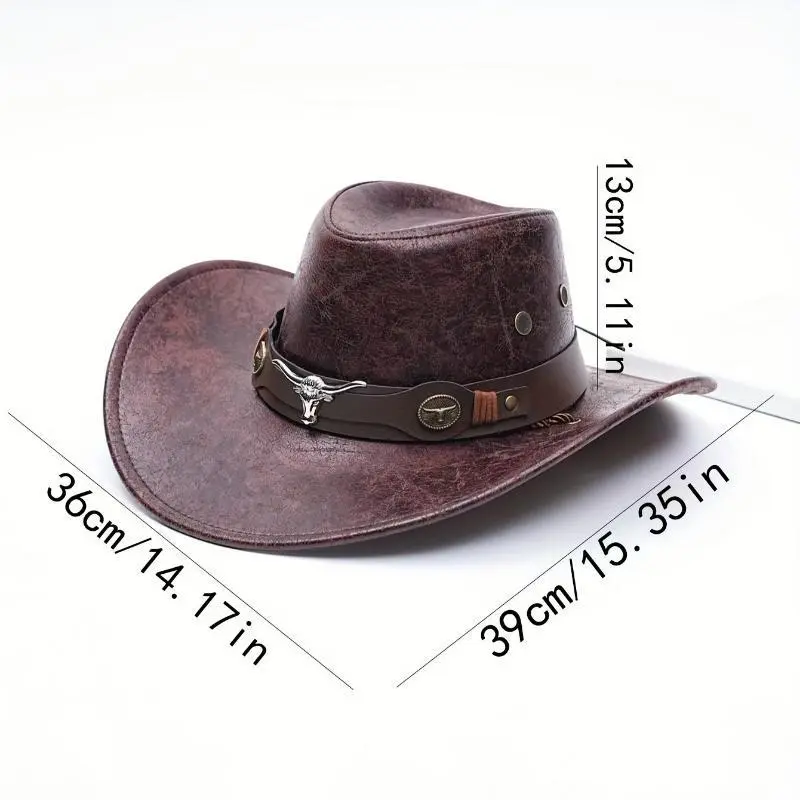 [Wide Brim Cowboy Hat Sun Protection] Western Cowboy Hat with Bull Head Buckle & Rivets - Wide Brim, Sun Protection for Outdoor Activities, Faux Leather Style tourism beach vacation casual cap