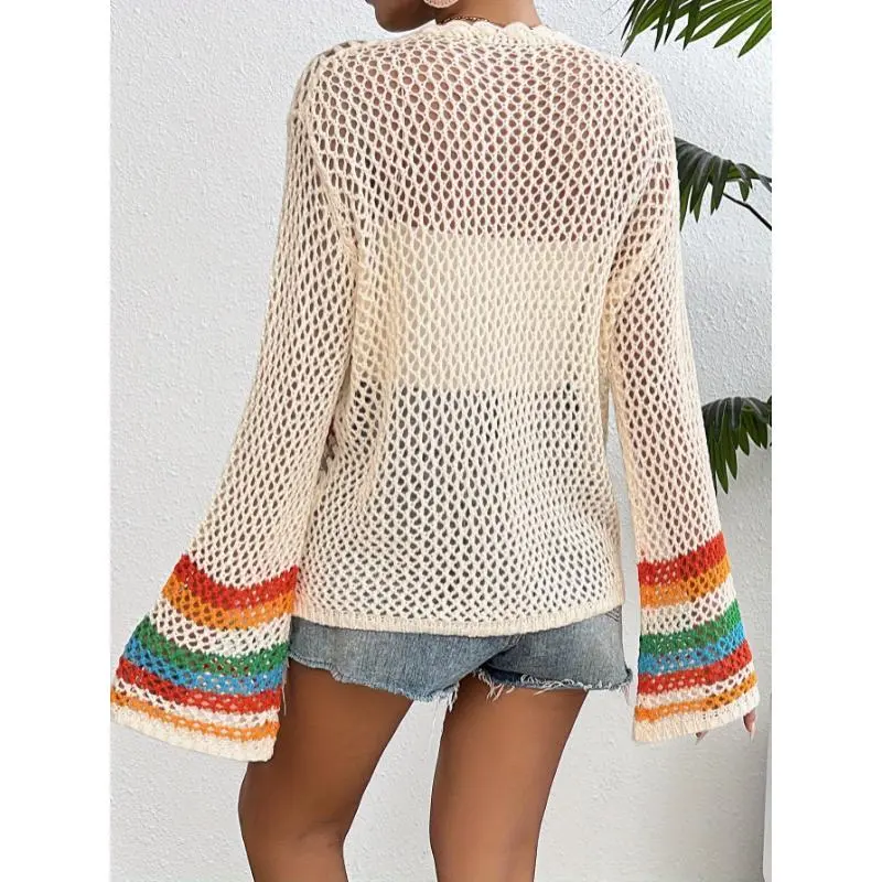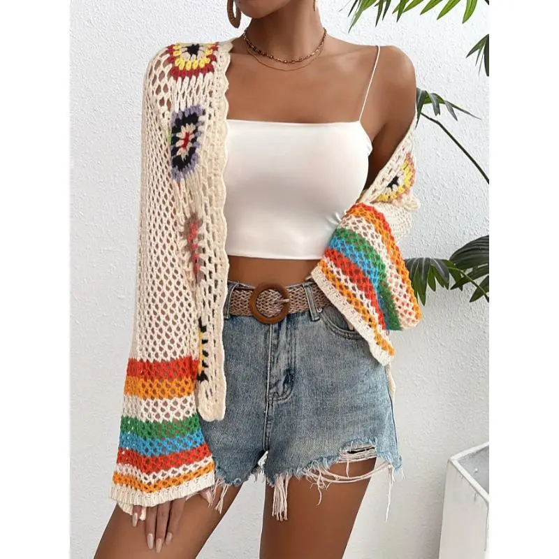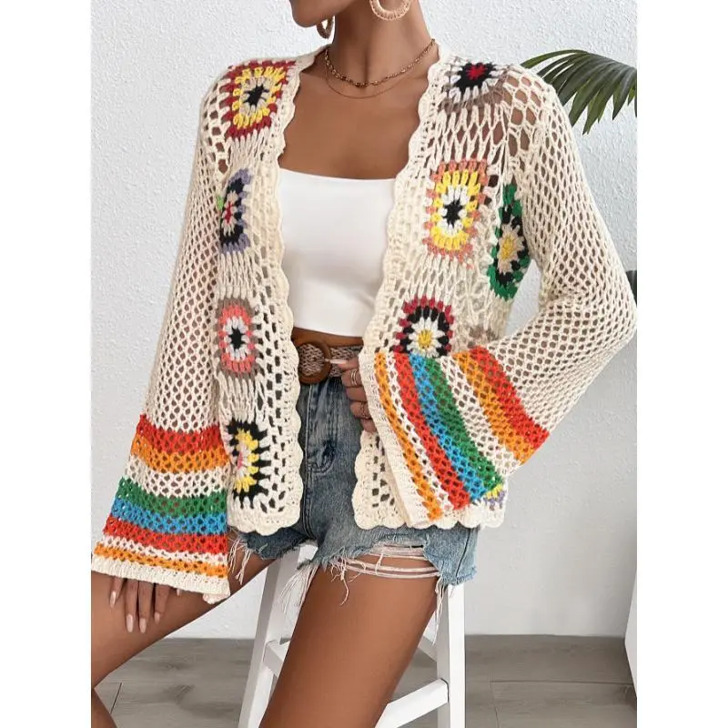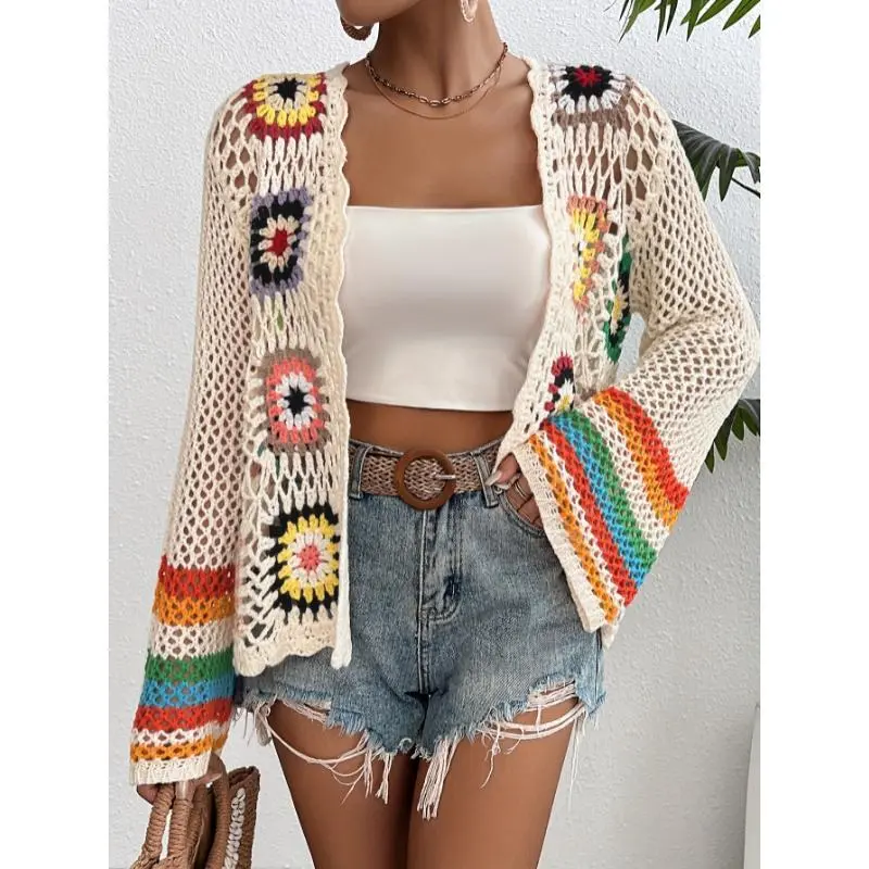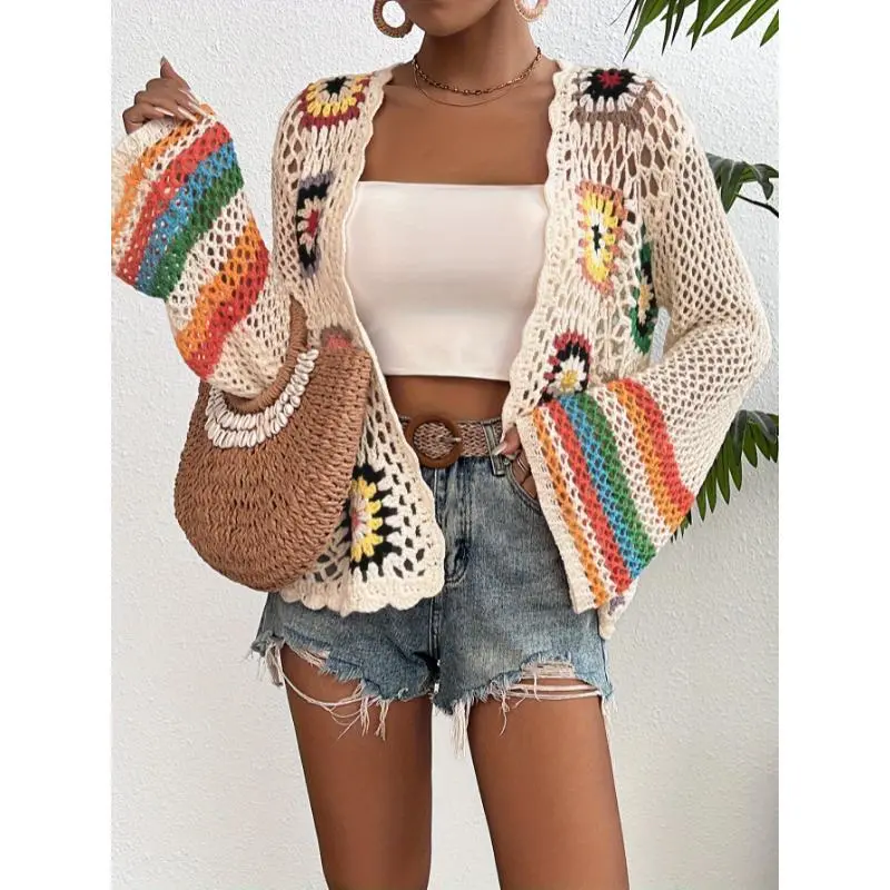 Crochet Open Front Cardigan - Casual Long Sleeve Hollow Out Cardigan for Women - Floral Fabric Knitwear, Comfortable Knitted Design Short Tops Womenswear Knitting