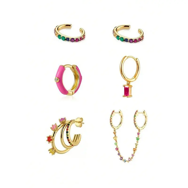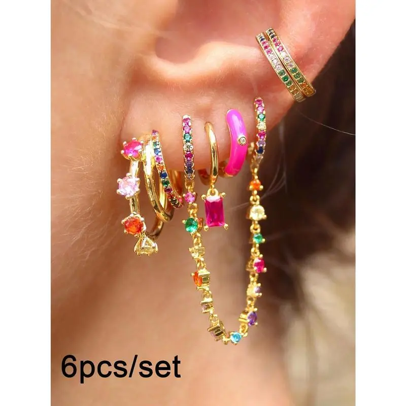 6 Pcs 24K Gold Plated Cubic Zirconia Dangle Earrings For Women Colorful Zirconia Hoop Earrings Set Fashion Jewelry
