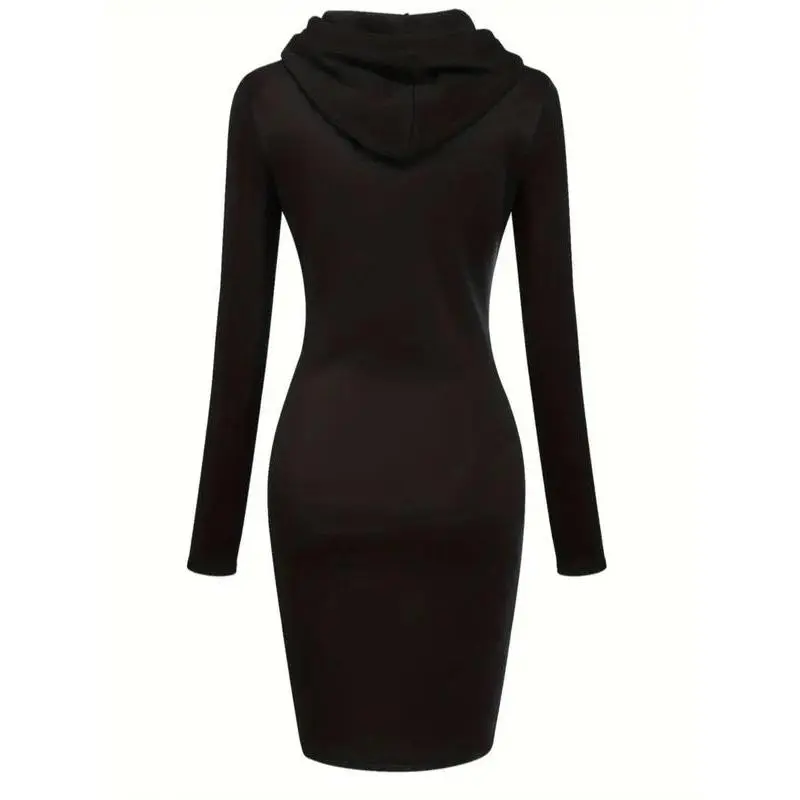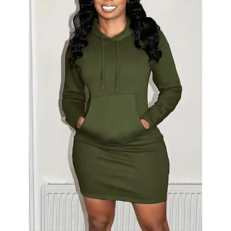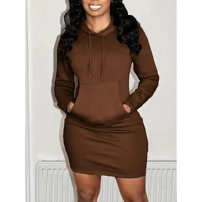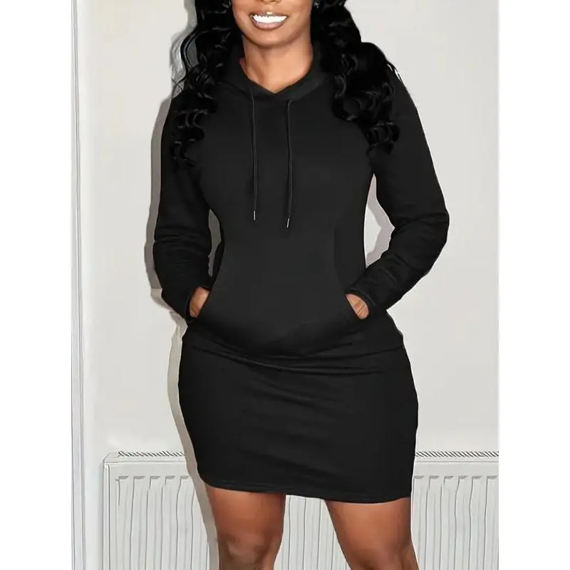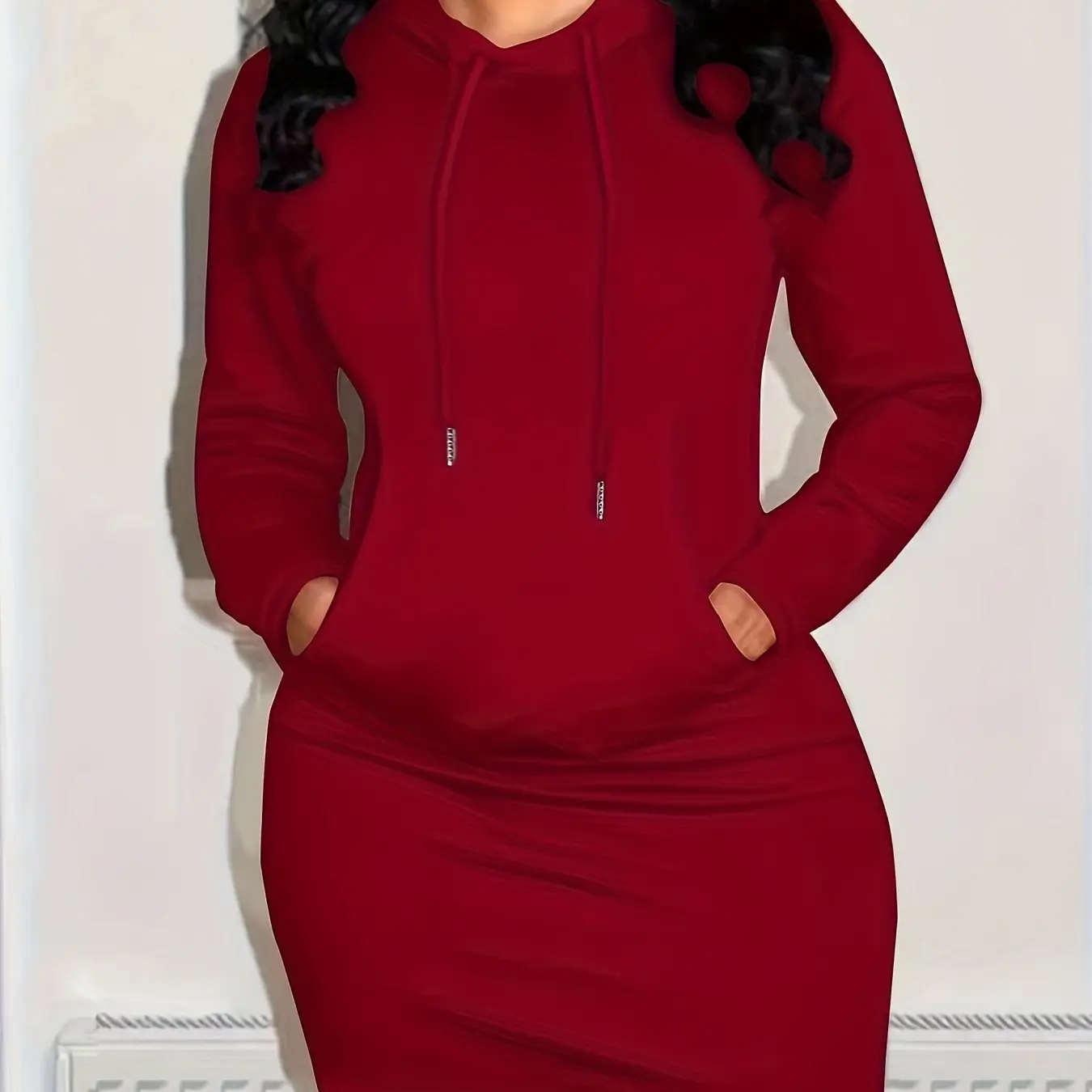 Women's Solid Silhouette Drawstring Hooded Sweatshirt Dress, Fall Outfits, Casual Slender Long Sleeve Pockets Dress for Fall, Ladies Clothes for Daily Wear