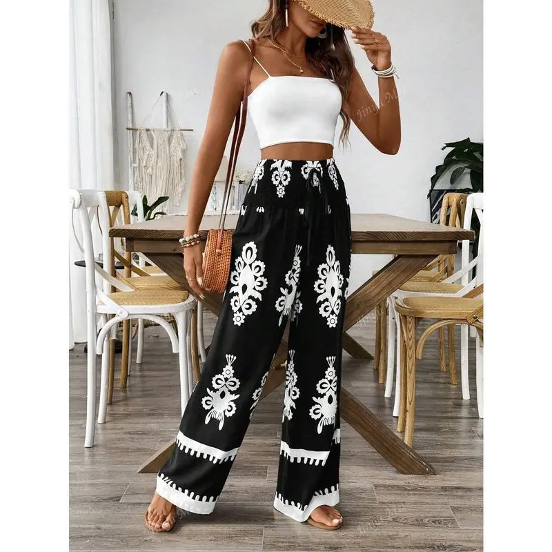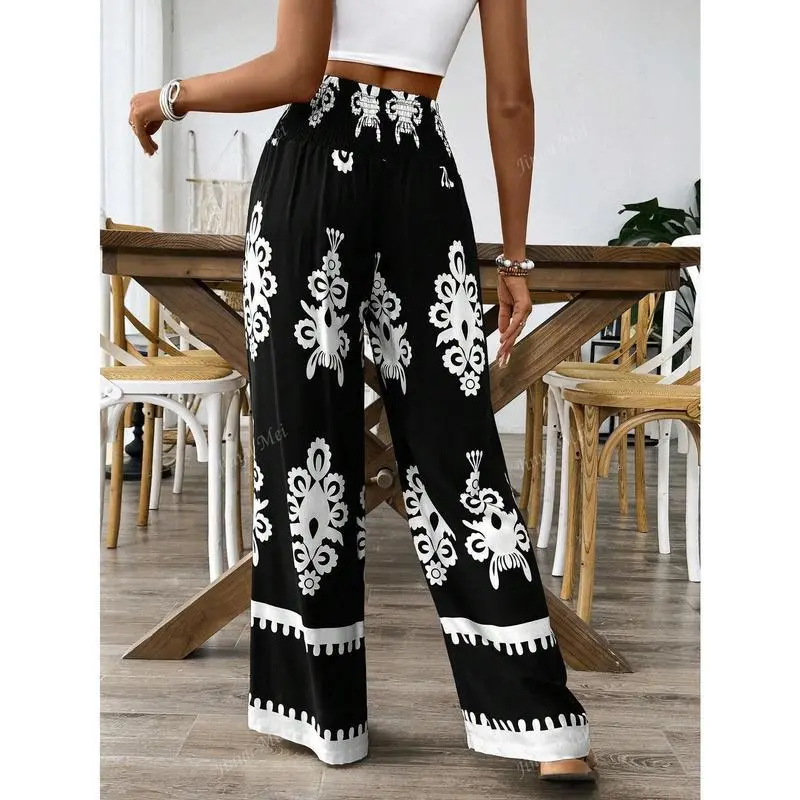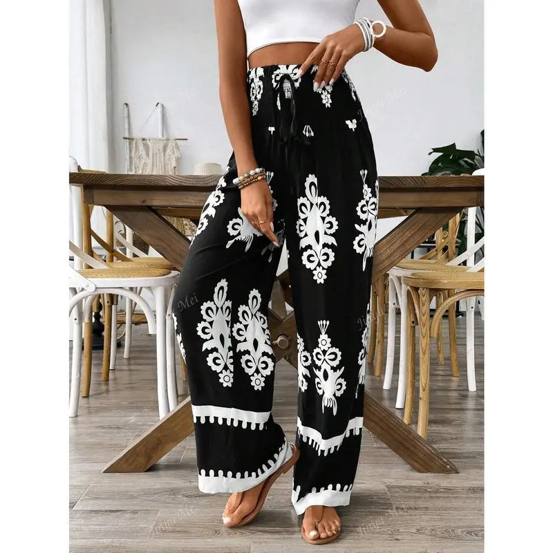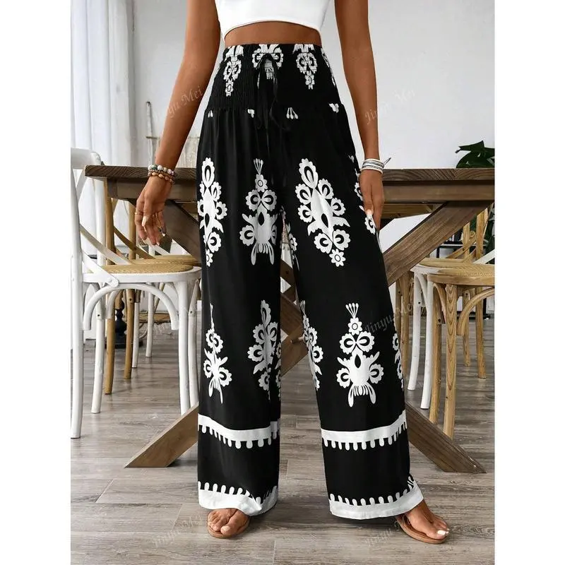Women's Elastic Drawstring Waist Wide Leg Random Floral Print Pants