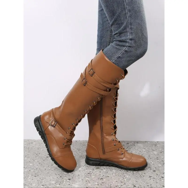 Women's zip-up lace-up flat motorcycle boots, classic knee-high tall boots. Made of comfortable PU fabric that is easy to clean, they are women's boots for autumn and winter 2025. These tall riding boots feature a versatile style.