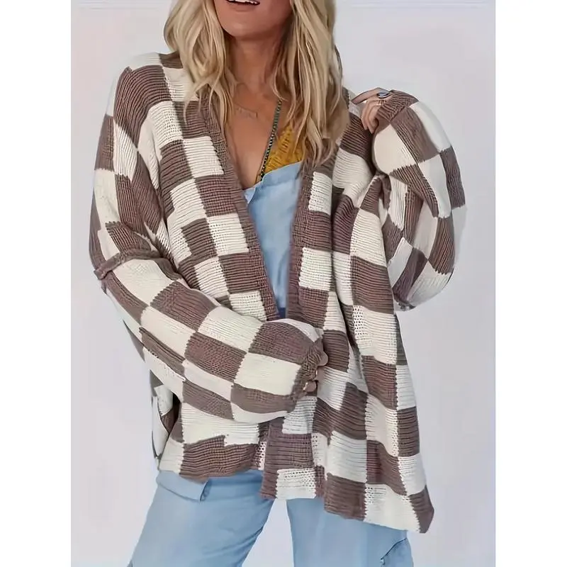 Women's Knitted Checkerboard Pattern Drop Shoulder Long Sleeve Cardigan for Daily Wear Knitwear Womenswear