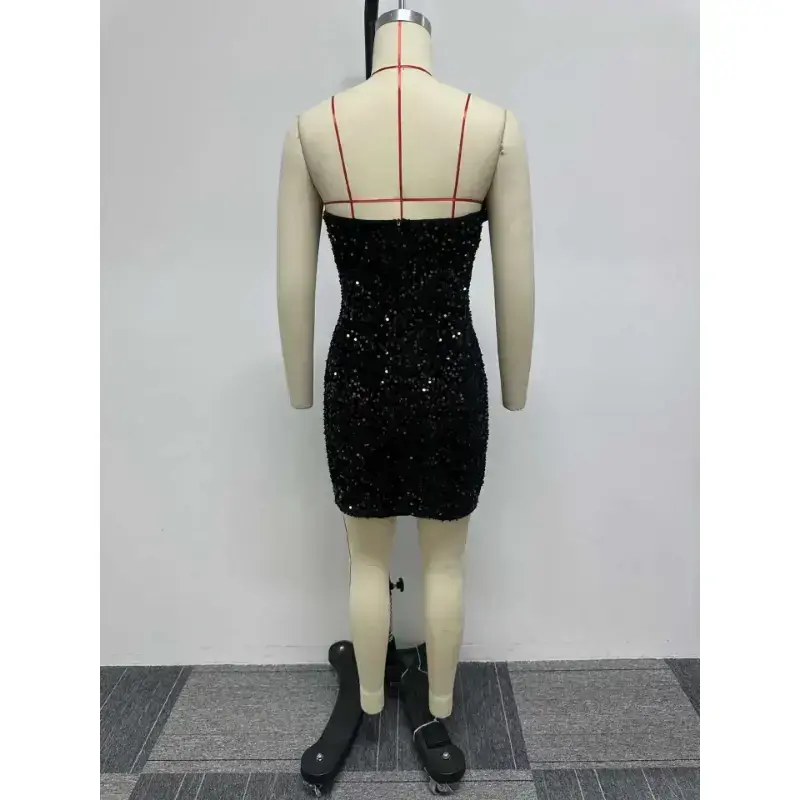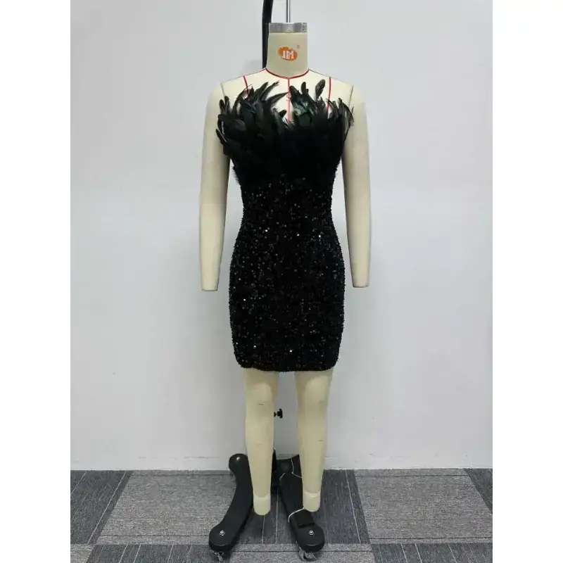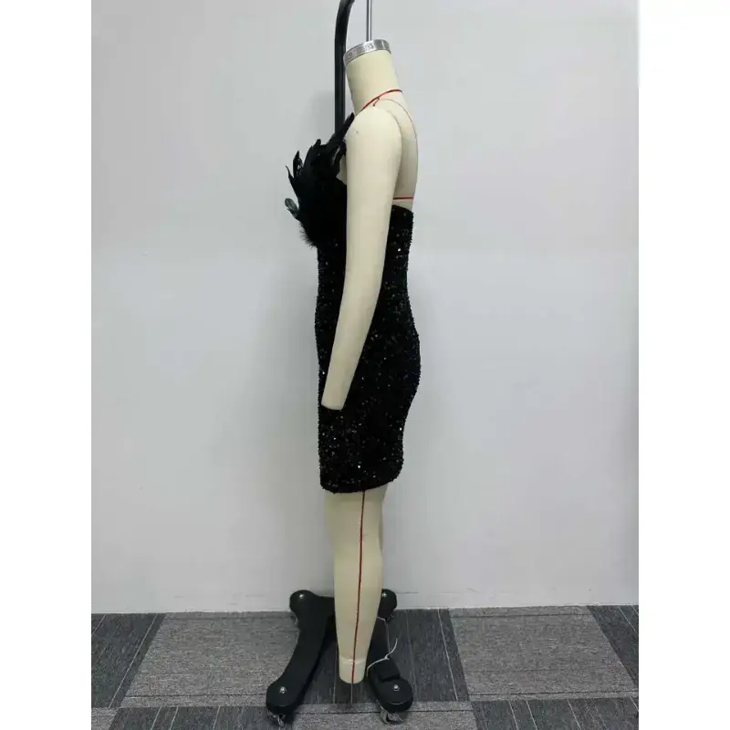 Summer Spring 2025 Women's Strapless Dress Slim Fit Off Shoulder Sleeveless Elegant Splice Feather Detail Black Sequined Design Gamis Check