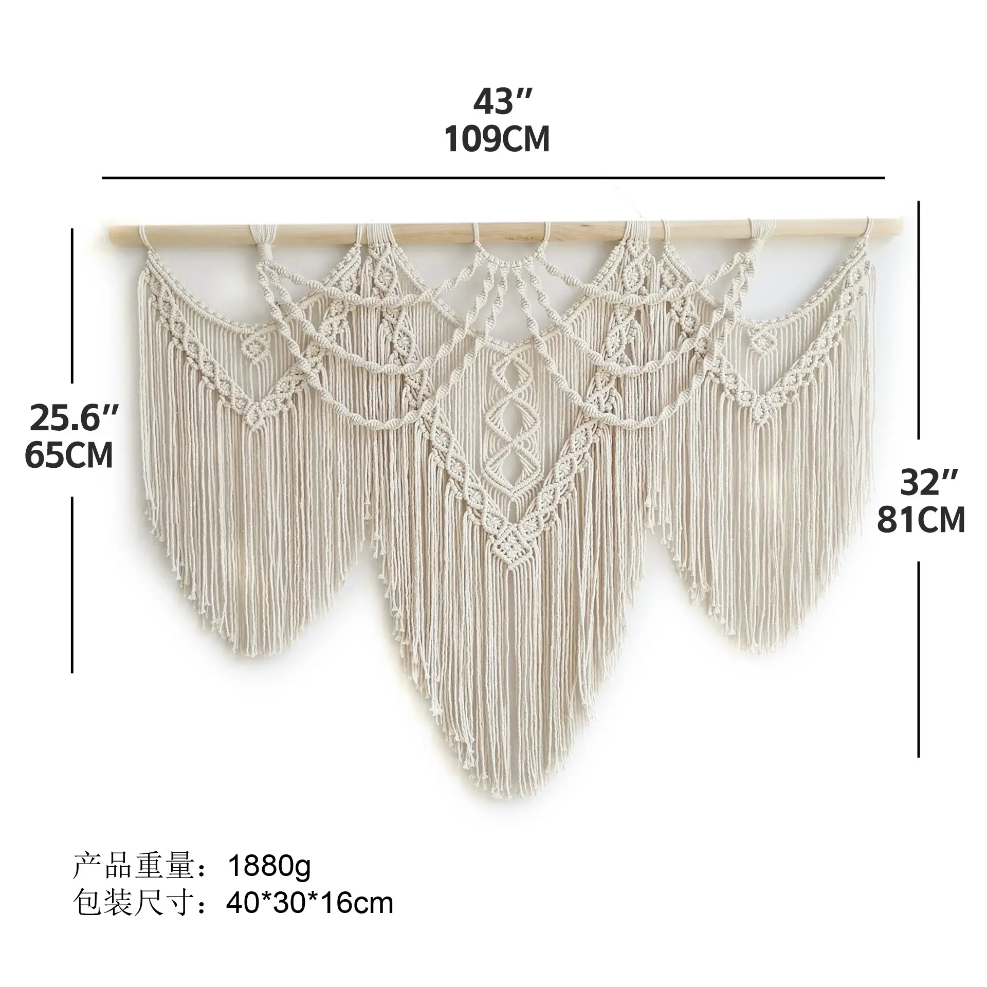 Large Macrame Wall Hanging-Boho Tapestry, Handmade Woven Wall Decor for Bedroom, Living Room, Apartment, Wedding Party - 43"x32" (Beige-fringe)