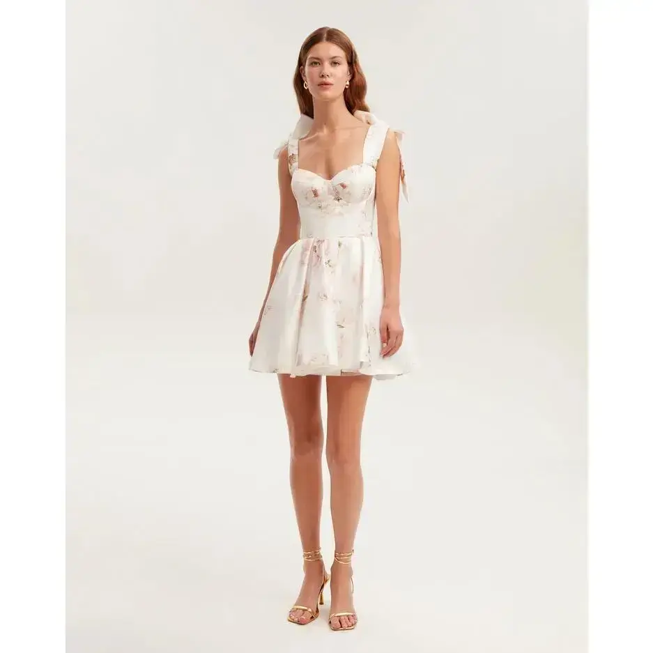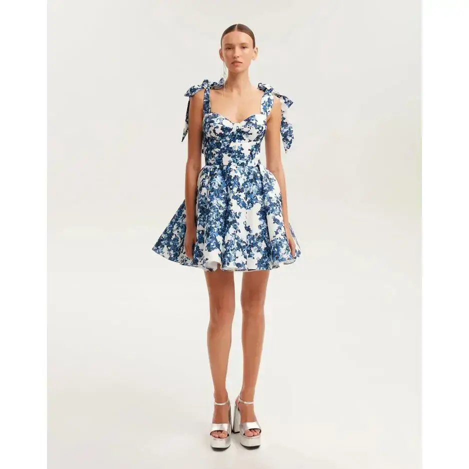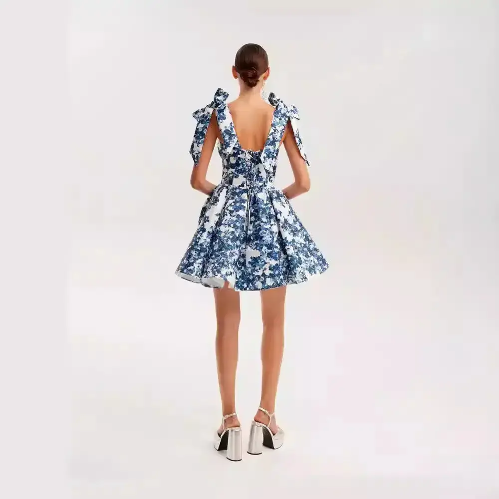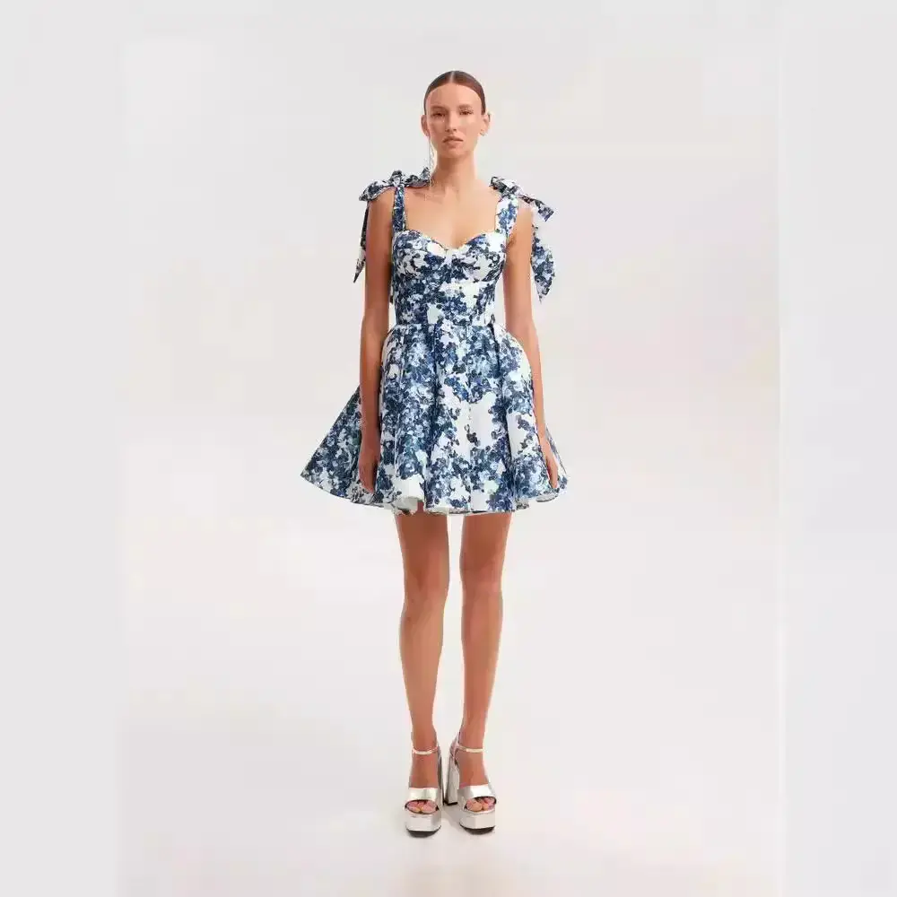 Women's Floral Print Backless Tie Shoulder Dress, Elegant Sweetheart Neck Short Dress for Summer, Lady Plunge Neck Dress, Fashion Women's Dress for Beach Holiday, Dresses for Women, Women's Clothing, Womenswear, Feminine Casual Wear, Bohemian Dresses