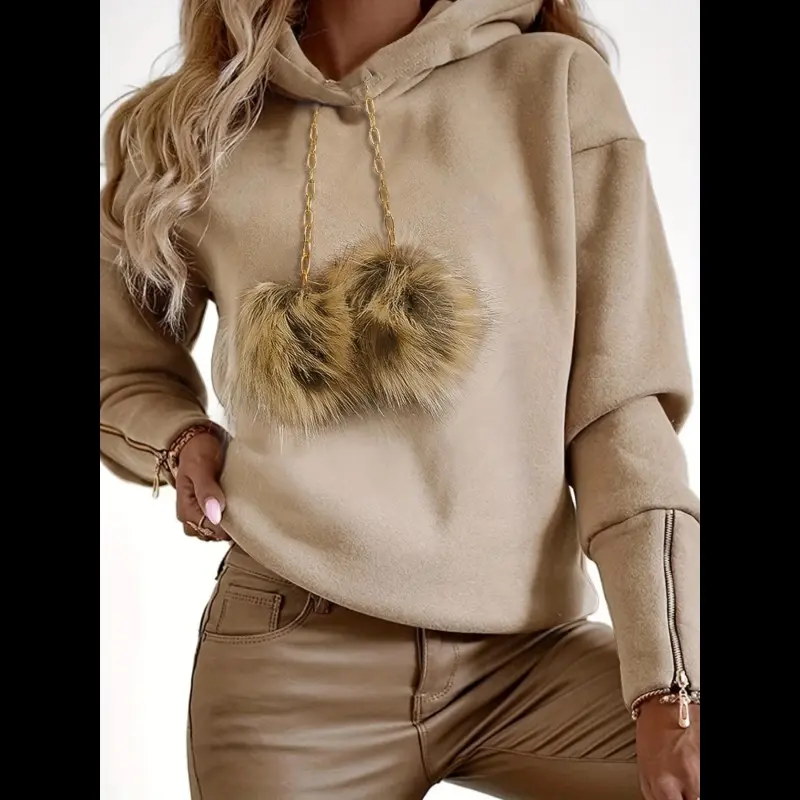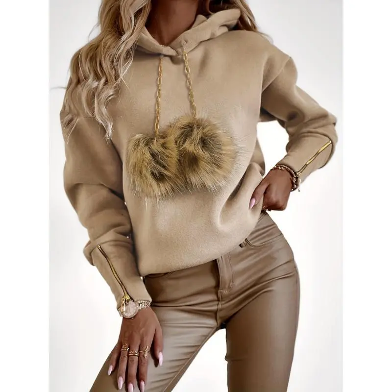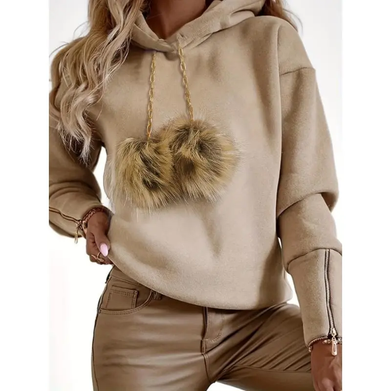 Cozy Fuzzy Pom-Pom Hoodie for Women - Casual Zip-Up Pullover, Polyester Blend, Perfect for Fall/Winter
