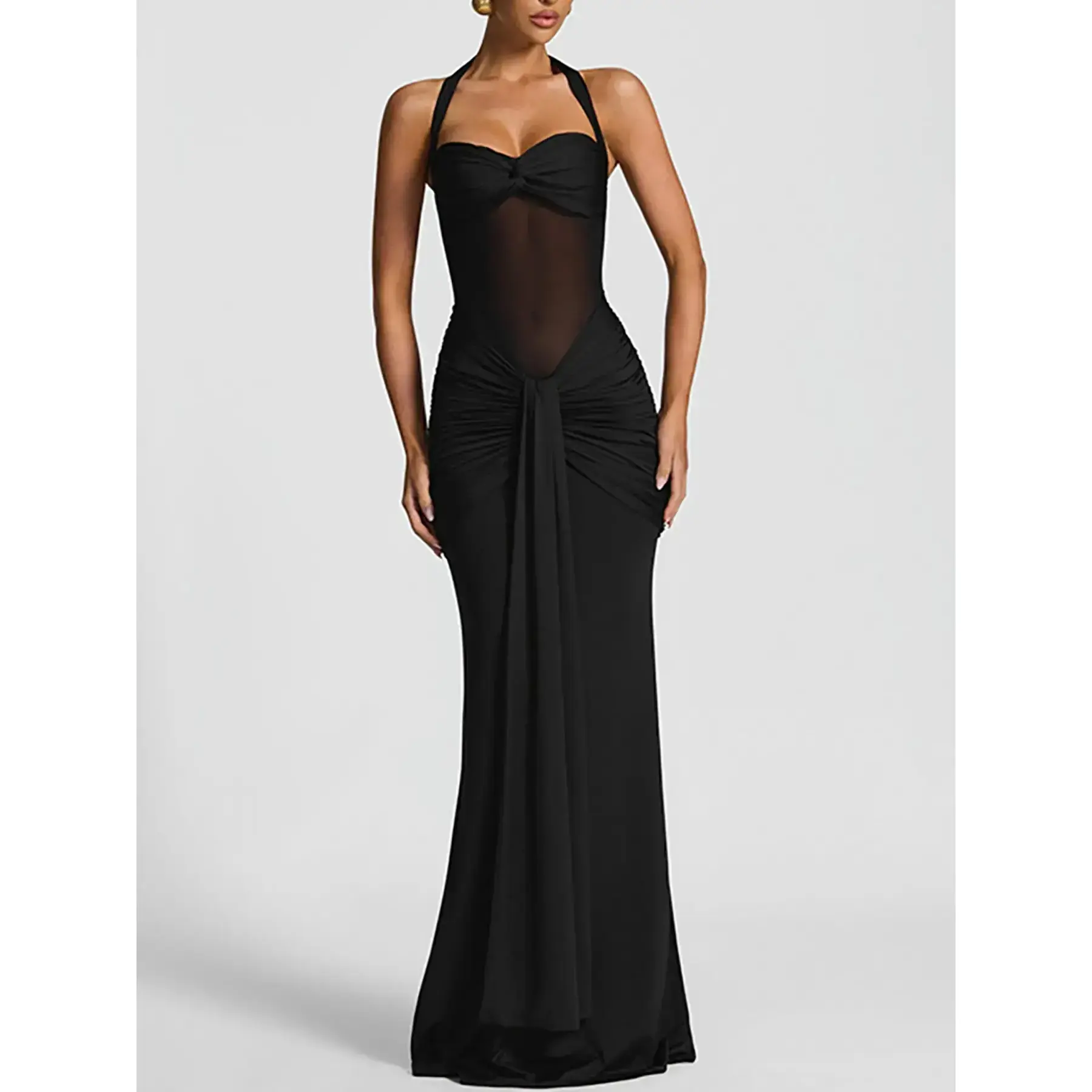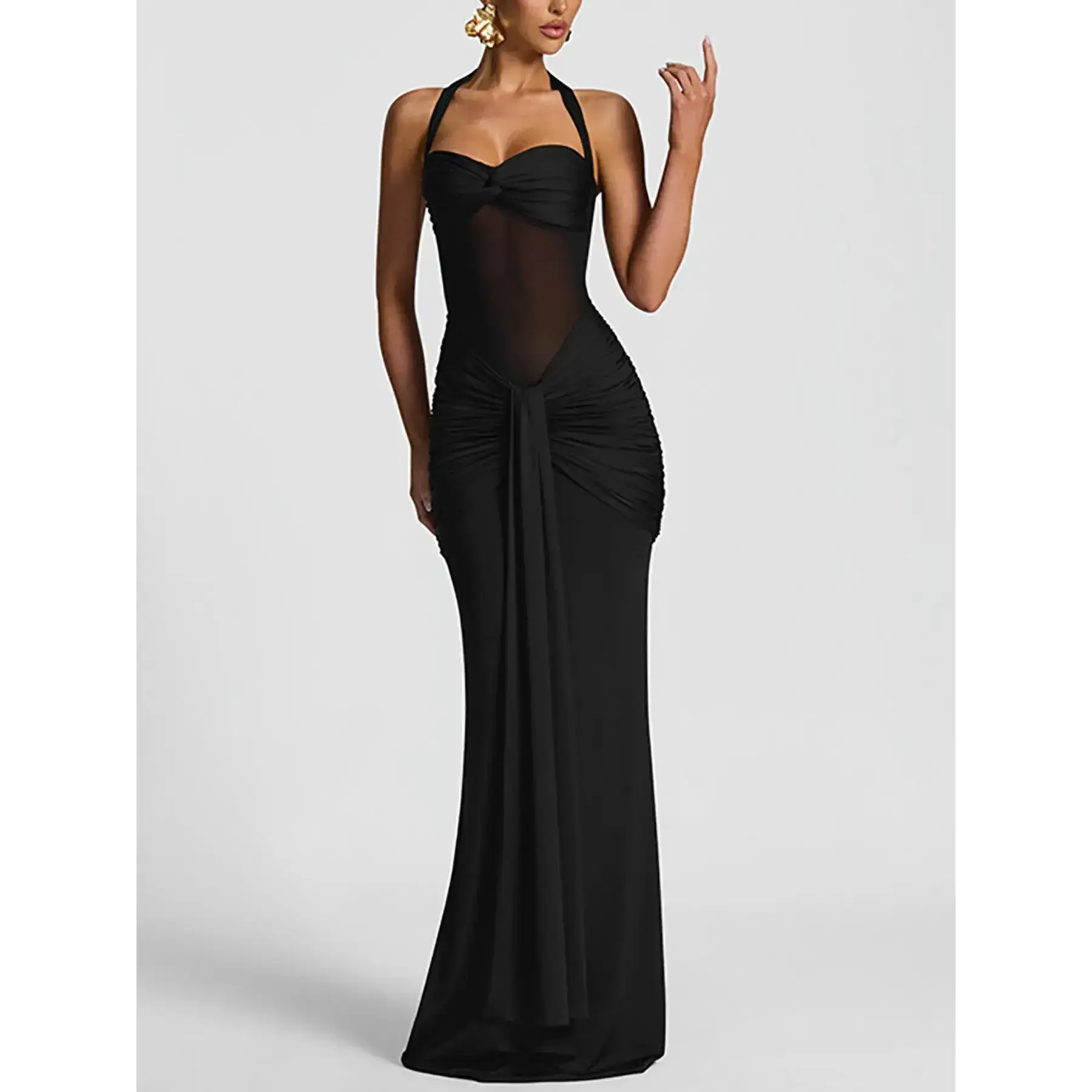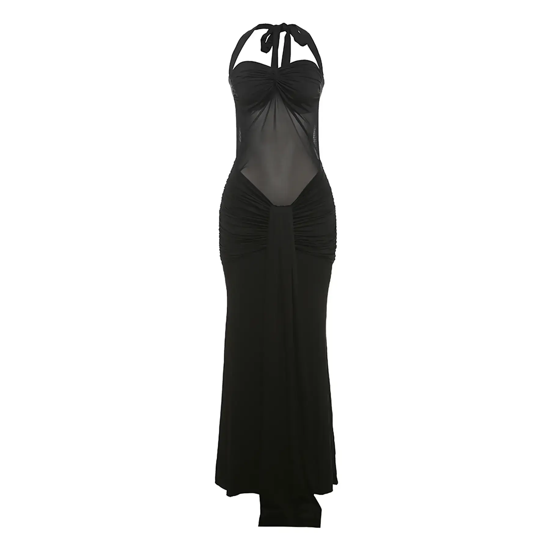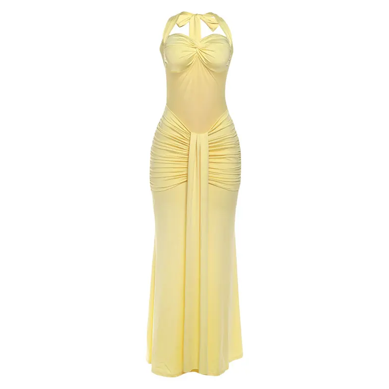 Women's Solid Color Mesh Patchwork Halter Neck Long Dress, Fashion See Through Sleeveless Backless Tie Back Dress, Casual Elegant Lady Clothing for Spring + Summer, Womenswear