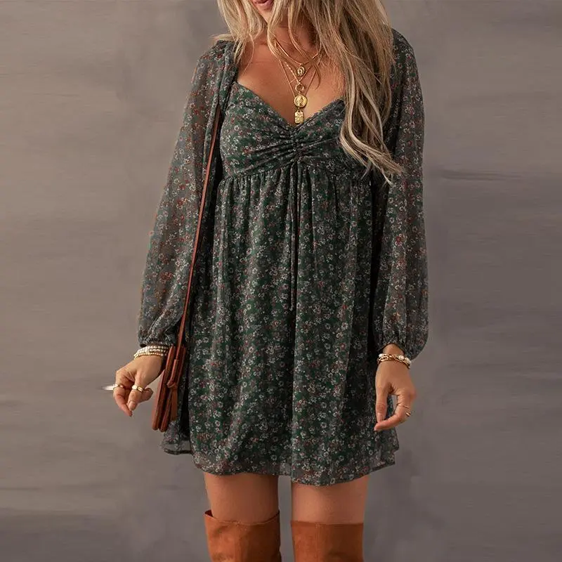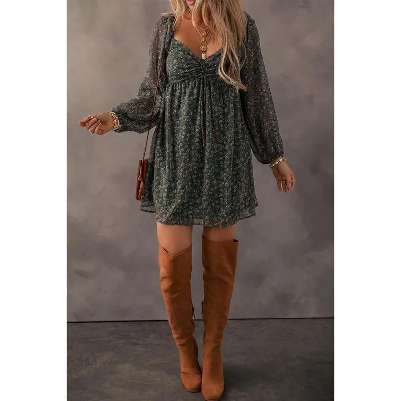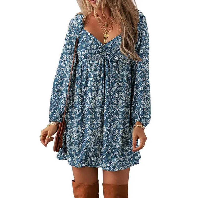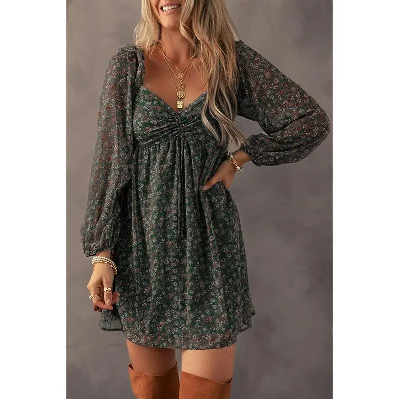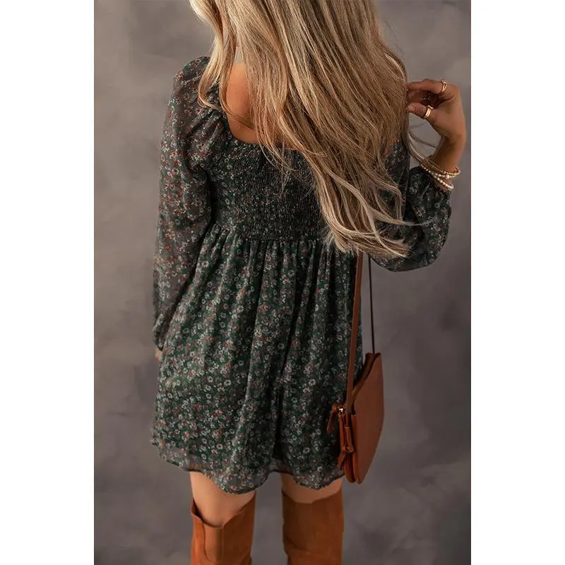 Women's Ditsy Floral Print Sweetheart Neck Shirred Back Dress, Bohemian Elegant Fashion Chic Bishop Sleeve Dress for Daily Holiday Vacation Wear, Ladies Dress for All Seasons, Casual Summer Chic Womenswear, Casual Loose Dress