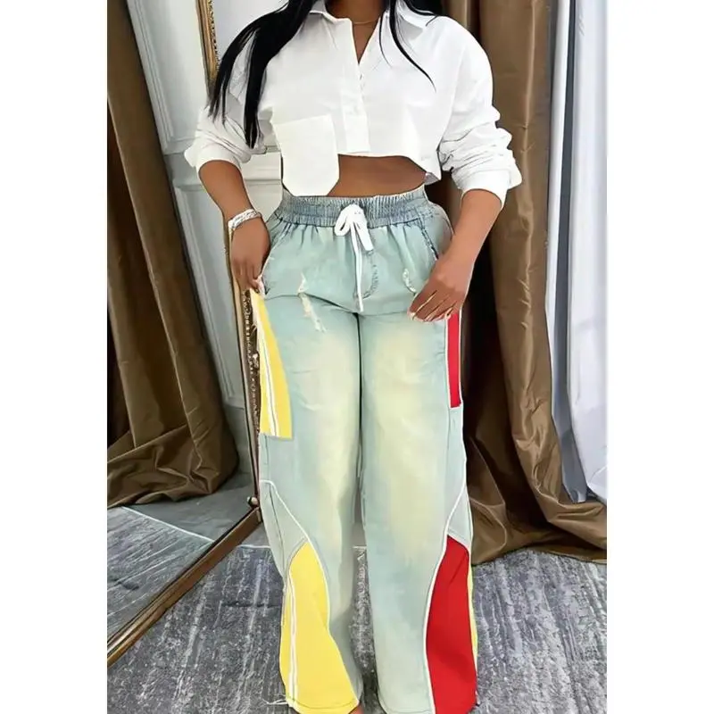 Women Striped Drawstring Jeans Elastic High Waisted Straight Wide Leg Baggy Sweatpants Jeans Basic Blue