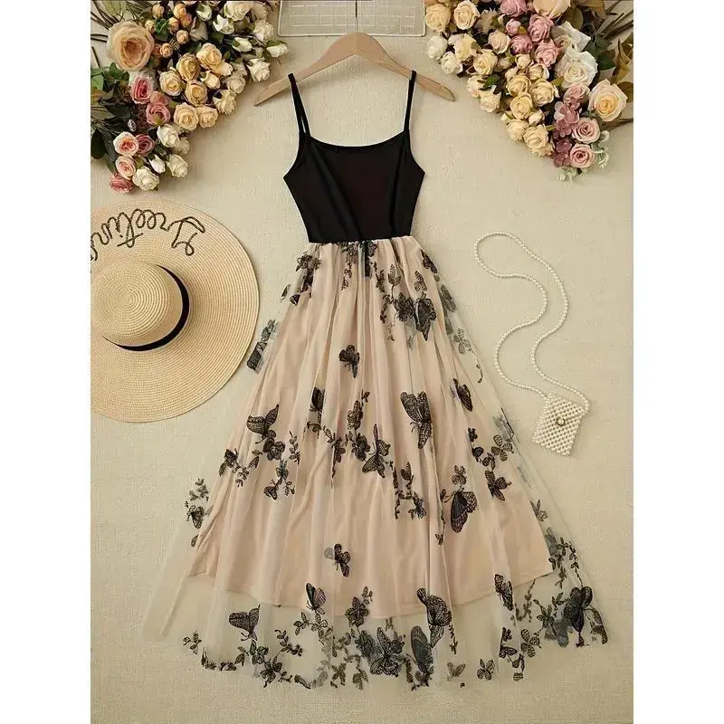 Elegant Women's Lace & Tulle Embroidered Cami Dress - Sleeveless, Backless Design with Floral Patterns, Perfect for Spring & Summer Events Casual Wear Statement Formal Womenswear