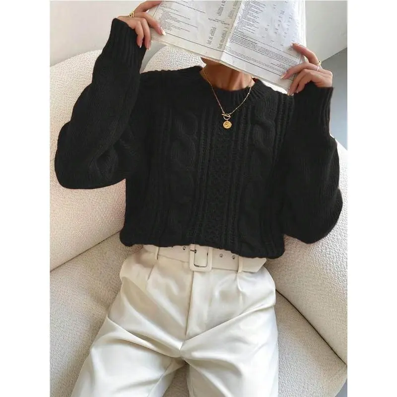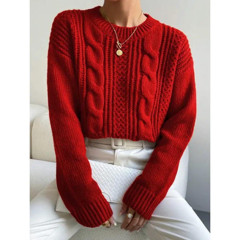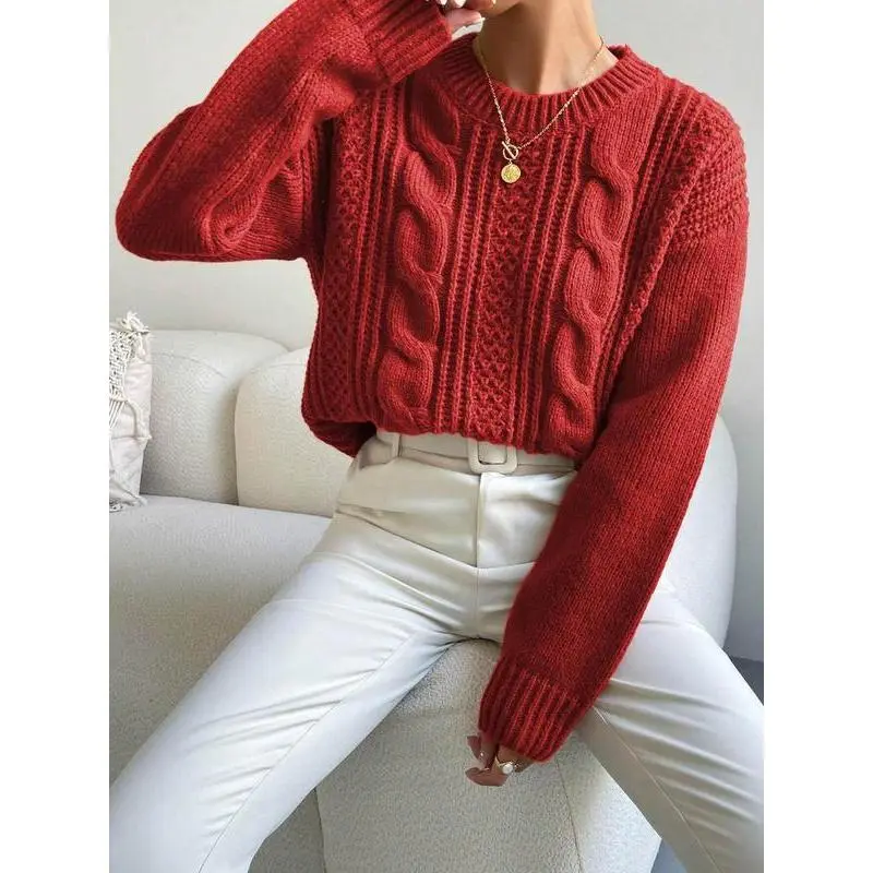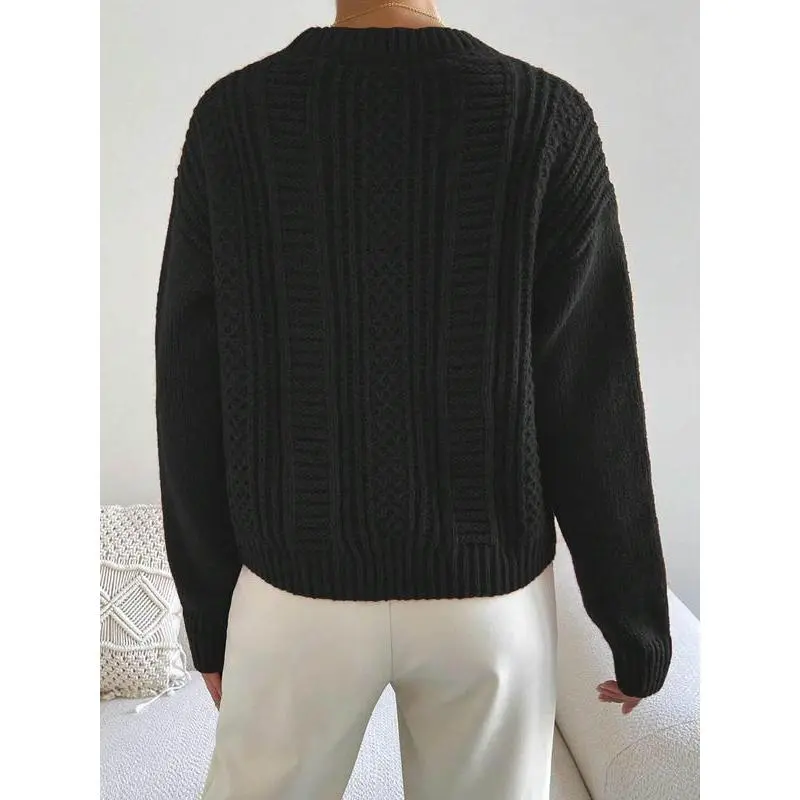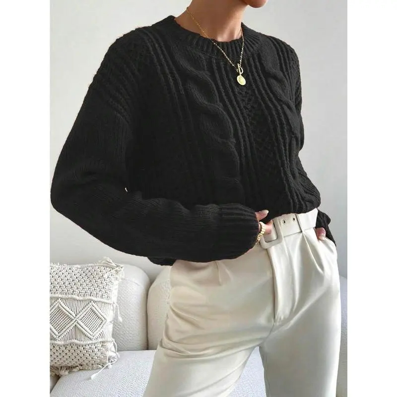 Women's Plain Cable Knit Crew Neck Sweater, Casual Drop Shoulder Long Sleeve Jumper for Fall & Winter, Fashion Ladies' Knitwear for Daily Wear