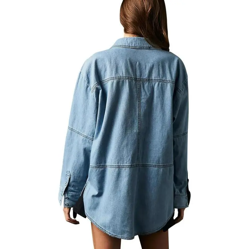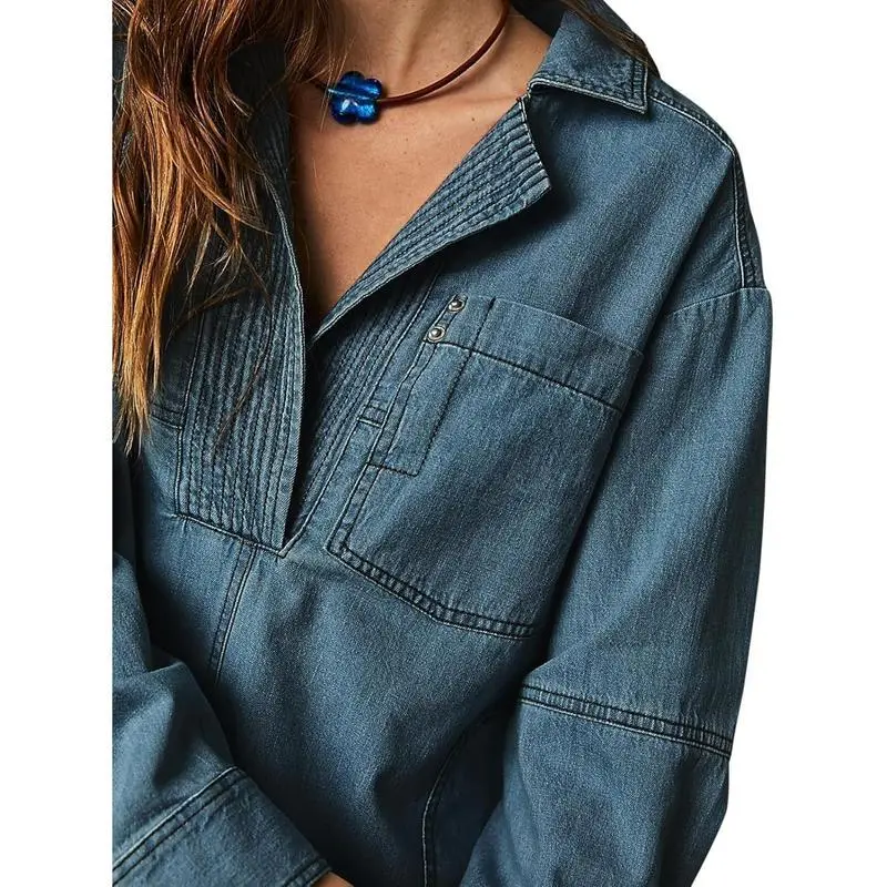Womens Denim Pullover Casual Button V Neck Blouse Loose Fit Long Sleeve Jean Jacket with Pocket