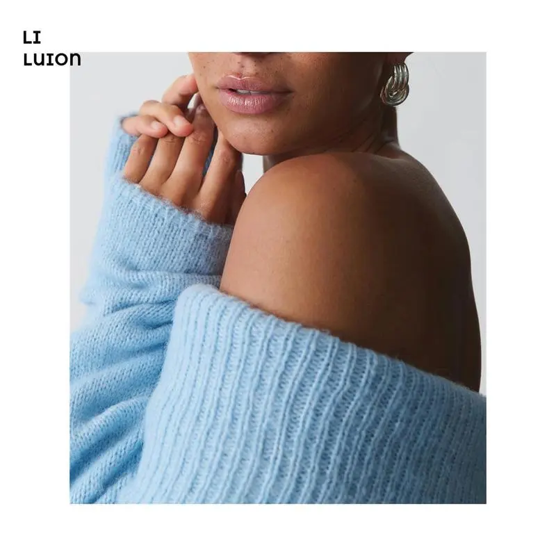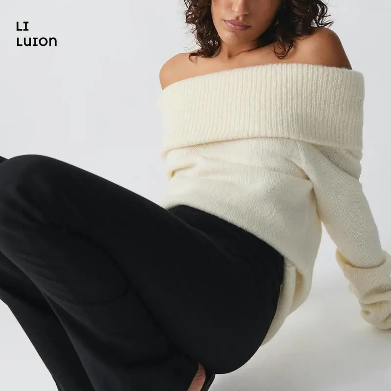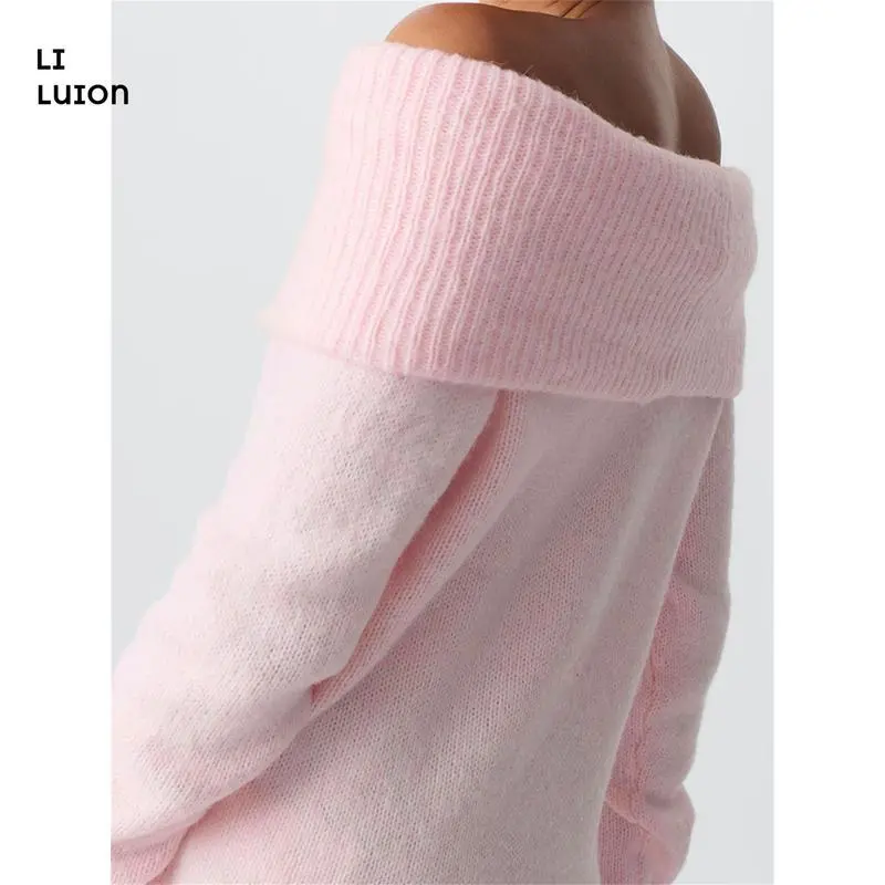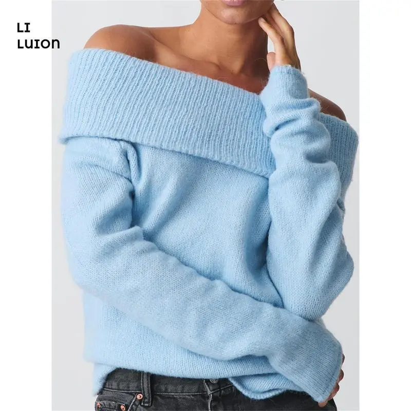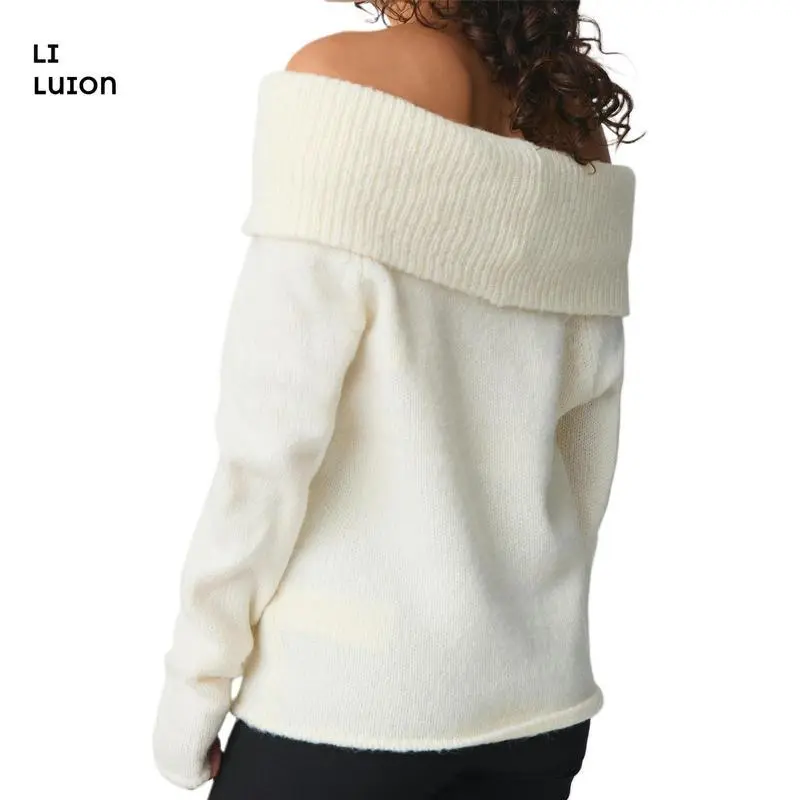 Women's Off Shoulder Crop Sweater Solid Color Boat Neck Long Sleeve Loose Knitwear Pullover