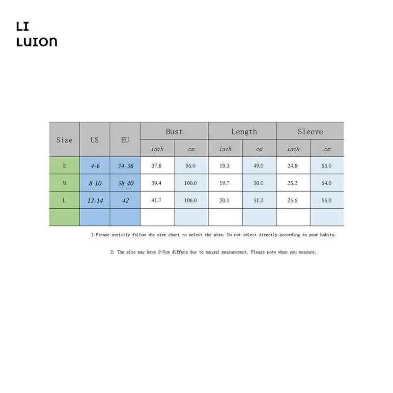 S Top Length: 49 Bust: 96 Sleeve: 63 M Top Length: 50 Bust: 100 Sleeve: 64 L Top Length: 51 Bust: 106 Sleeve: 65 S Top Length: 19.29 Bust: 37.8 Sleeve: 24.8 M Top Length: 19.68 Bust: 39.37 Sleeve: 25.2 L Top Length: 20.08 Bust: 41.73 Sleeve: 25.59 Material: 100% Polyester Sleeve Length: Long Sleeve Pattern: Solid Color 1. Due to manual measurement, there may be an error of 1-2 cm in size. 2. Depending on the computer monitor used, colors may differ from actual colors. If the product has any quality problems, please let us know, we will help you solve the problem as quickly as possible.