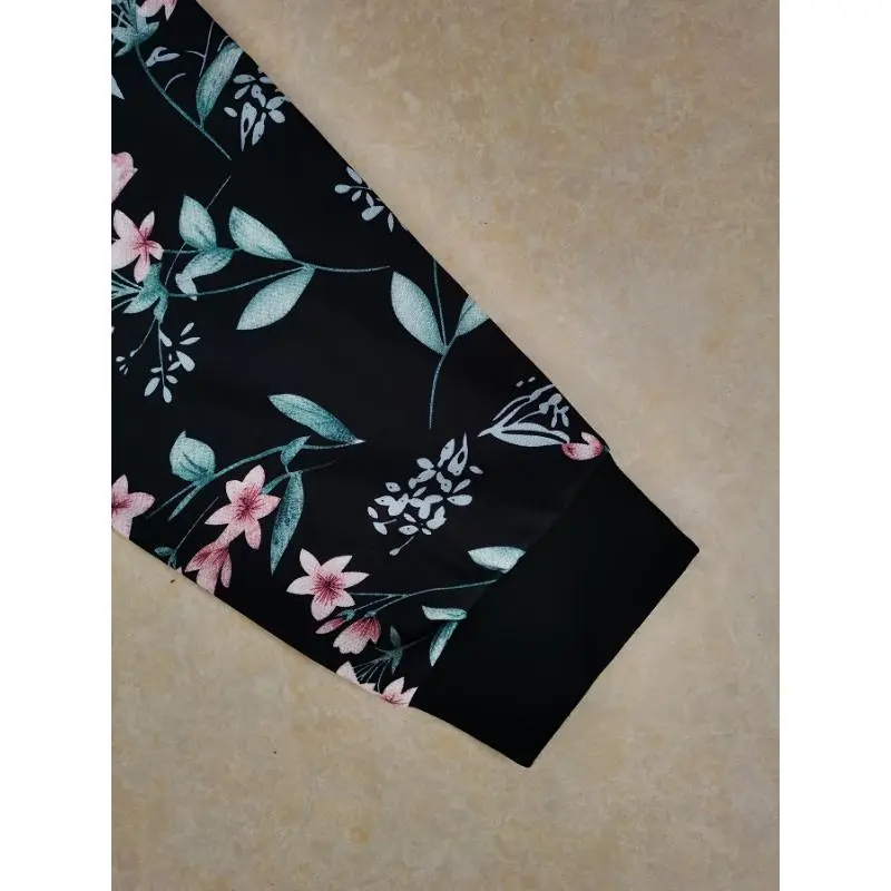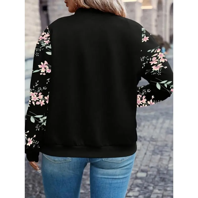 Chic Plus Size Floral Print Bomber Jacket for Women - Casual Zip-Up Baseball Collar Coat, Machine Washable