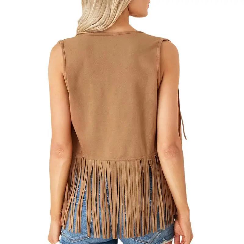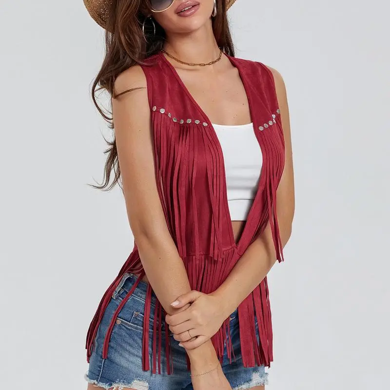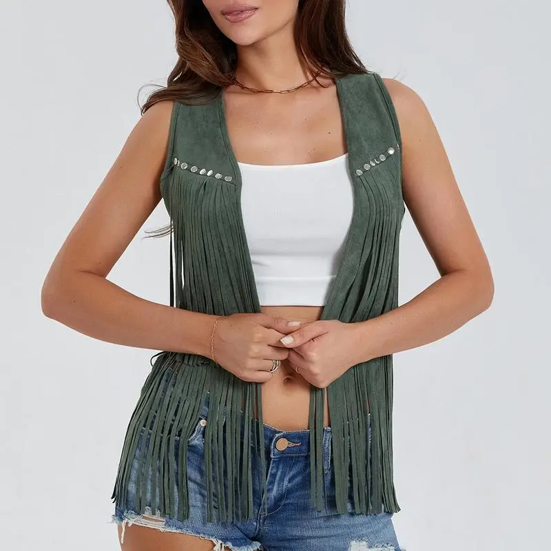 Women Hippie Waistcoat Vest Lightweight Solid Color Open Front Sleeveless Jacket with Tassel for Streetwear Outerwear Faux Suede Tassel Vest Fashion Rivets Fringe Waistcoat Open Front