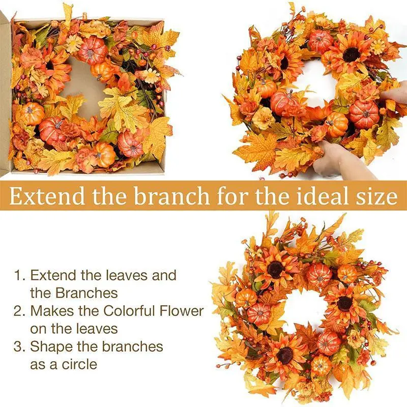 【Vibrant Autumn Colors】: Features bold hues of orange, red, and yellow, capturing the essence of fall with a lively touch. 【Realistic Materials】: Crafted from high-quality imitation materials, providing a lifelike appearance while ensuring durability. 【Seasonal Versatility】: Suitable for various occasions like Thanksgiving and Halloween, making it a multifunctional decor item for your home. 【Elegant Arrangement】: Showcases a harmonious blend of maple leaves and pumpkins, creating a visually appealing centerpiece for any door. 【Easy Installation】: Designed for convenient hanging on doors or walls, ensuring that you can decorate your space effortlessly.