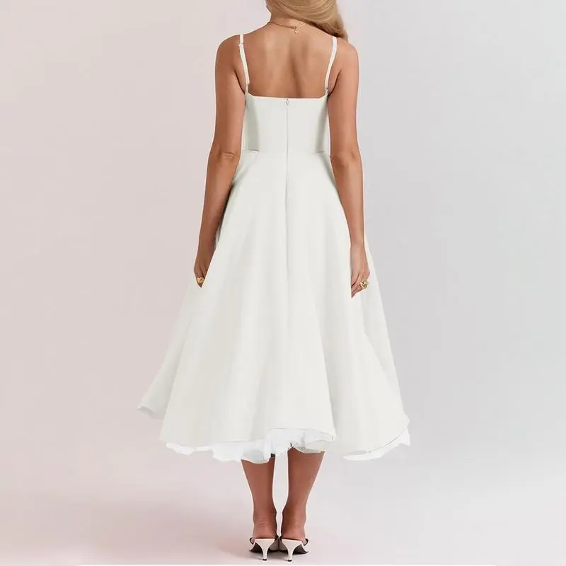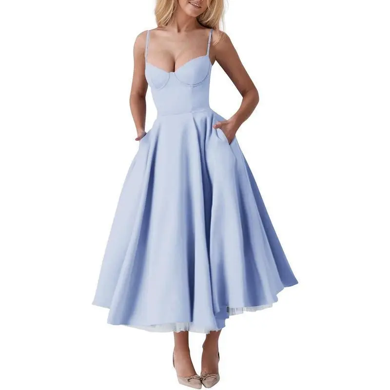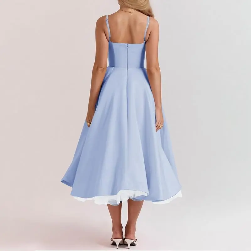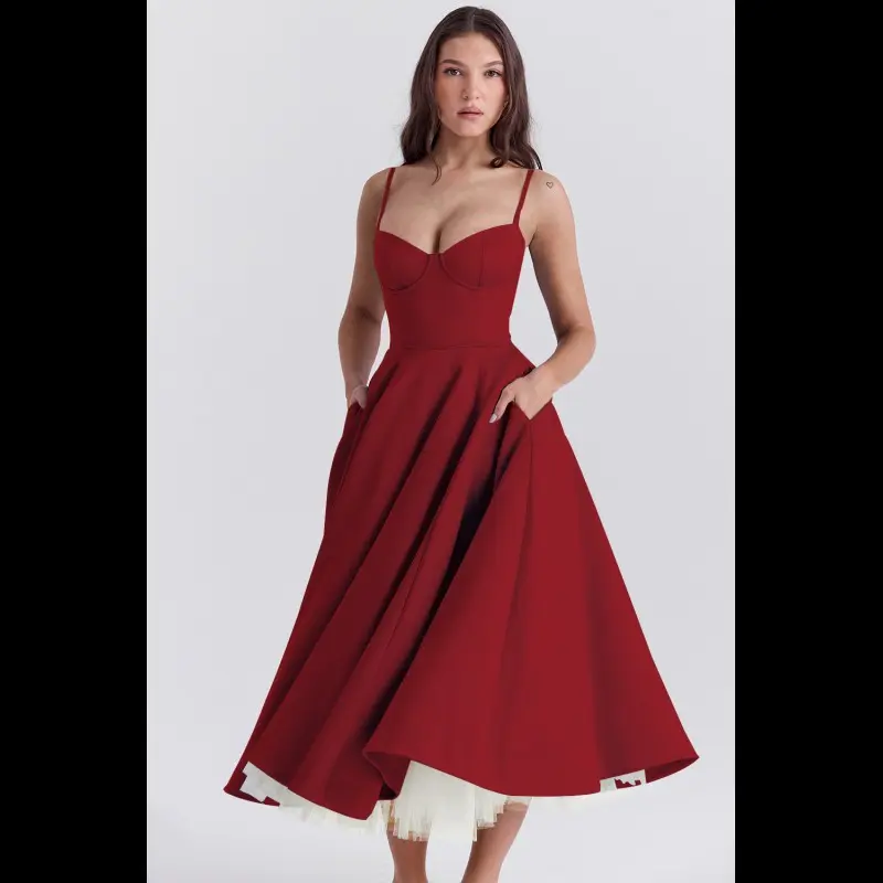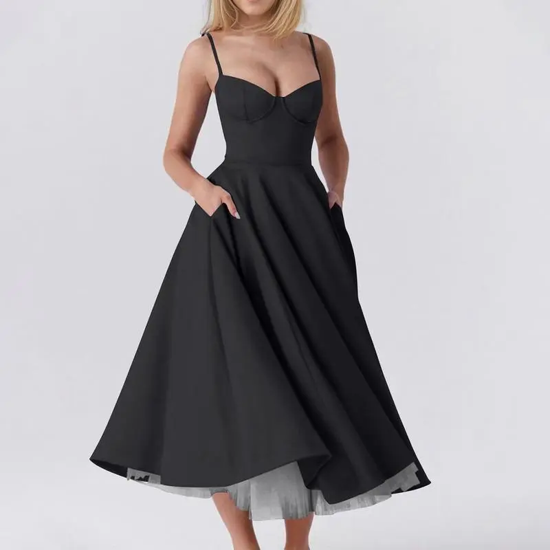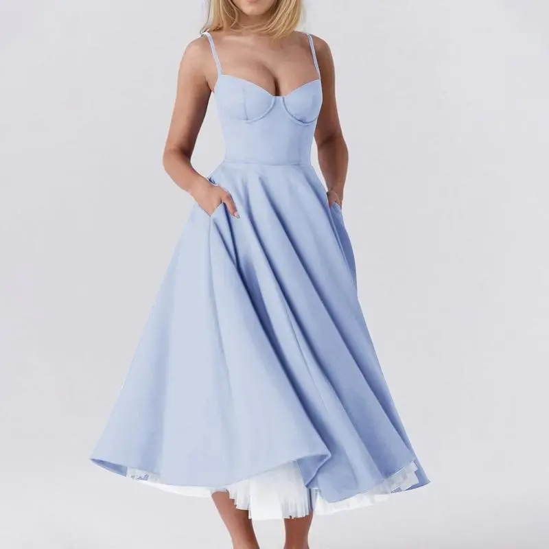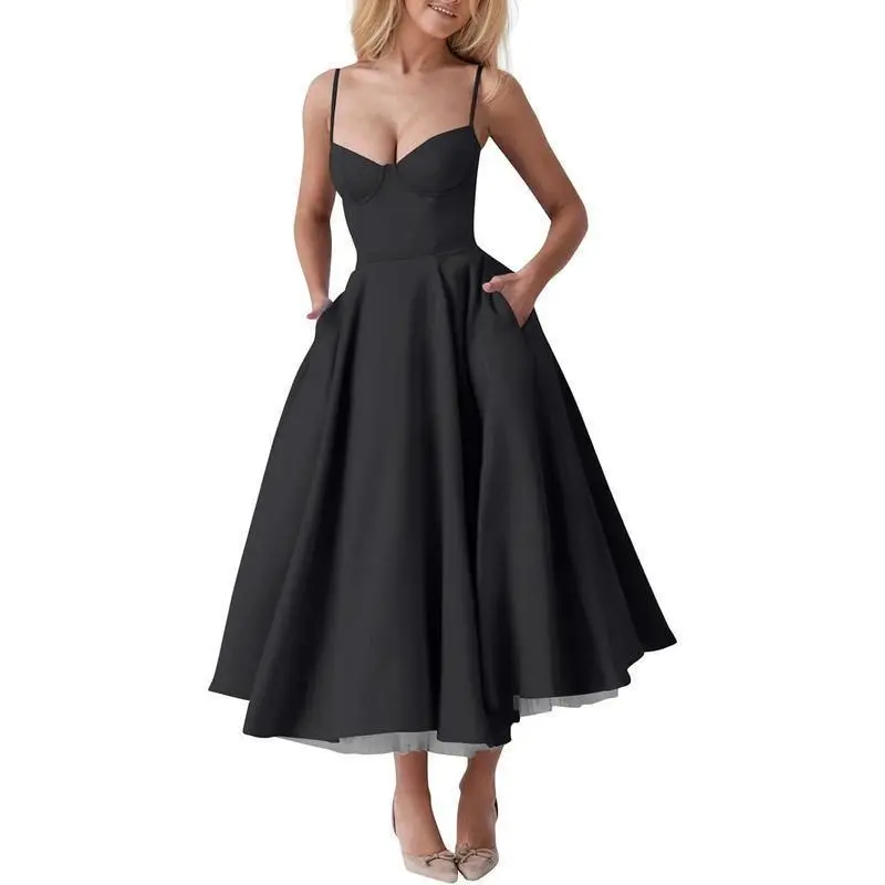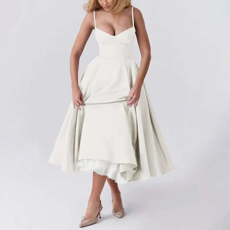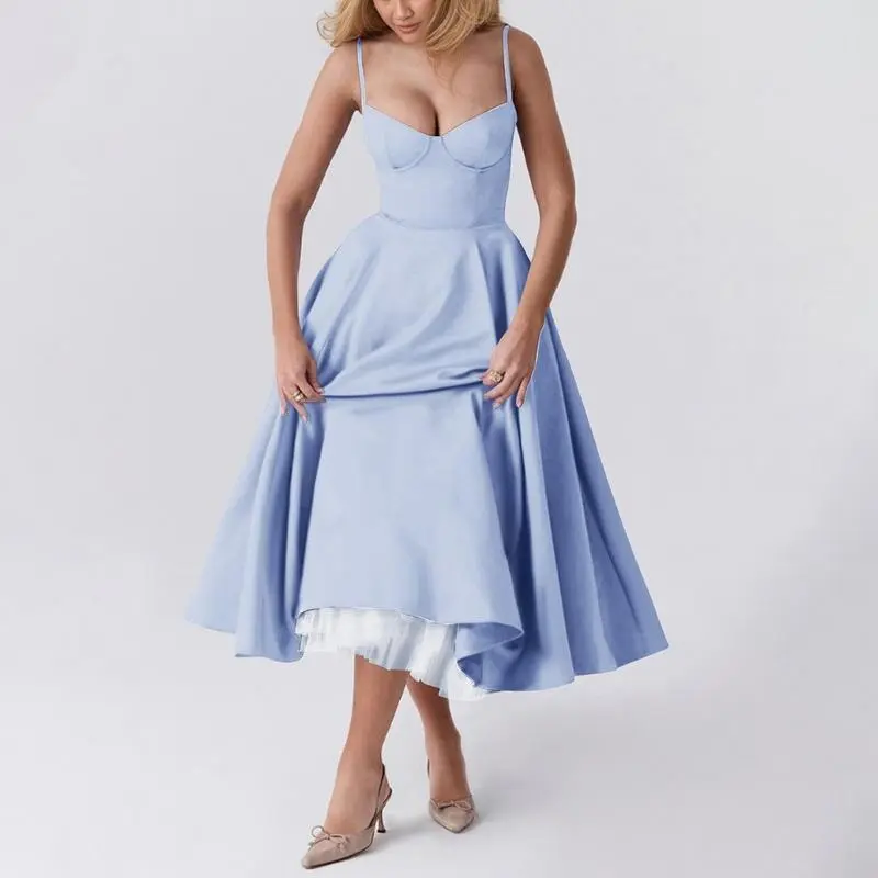 Womens Corset Dress Spaghetti Strap Bustier Midi Dress Vintage Party Dress Flowy Pleated Hem Low Cut Prom Dresses