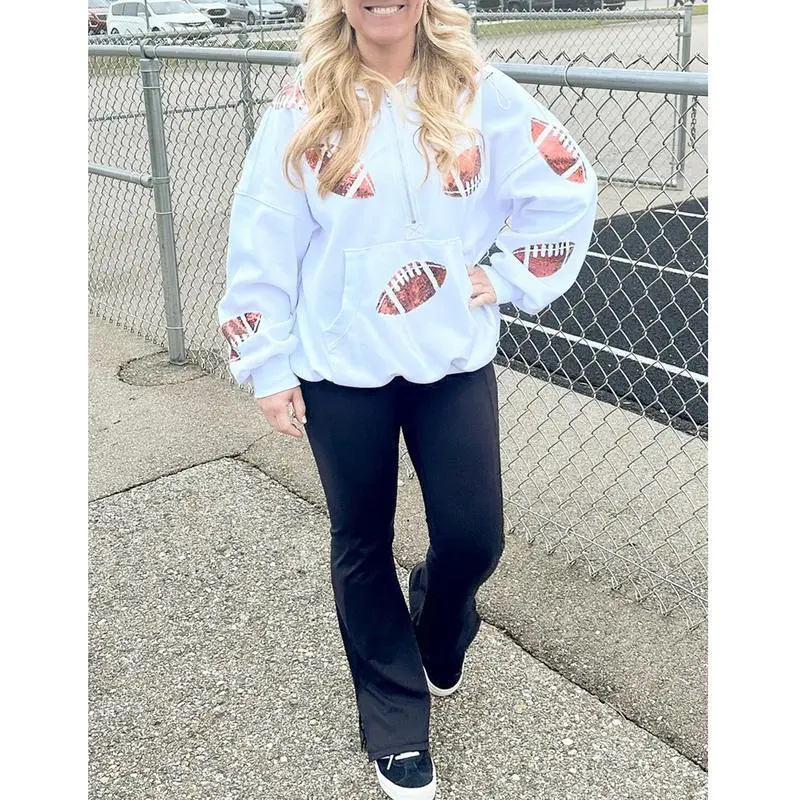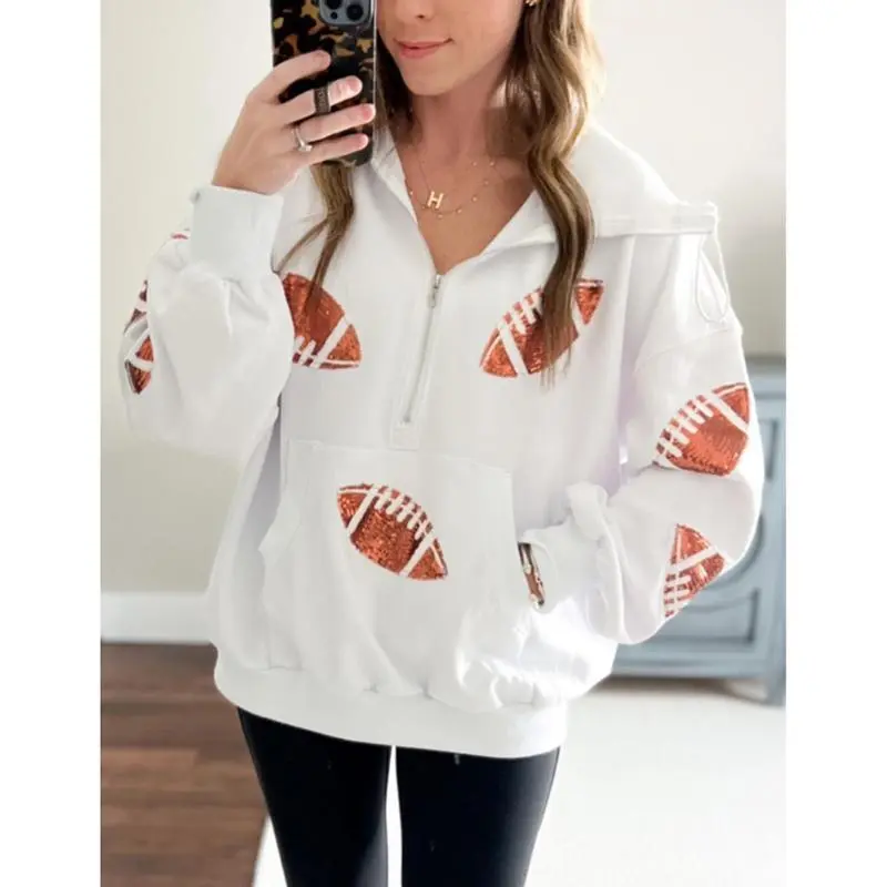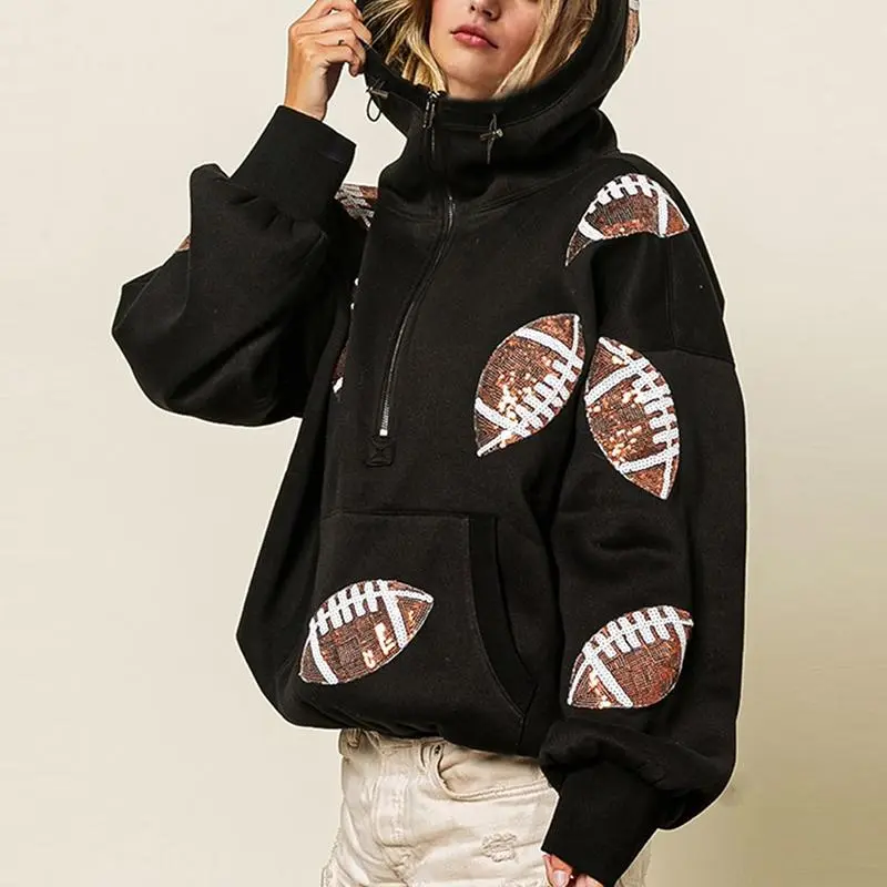 Kingapril Women's Game Day Sweatshirts Football Sequin Hoodies Tailgate Outfits Long Sleeve Zipper Sweaters with Pocket Casual Womenswear