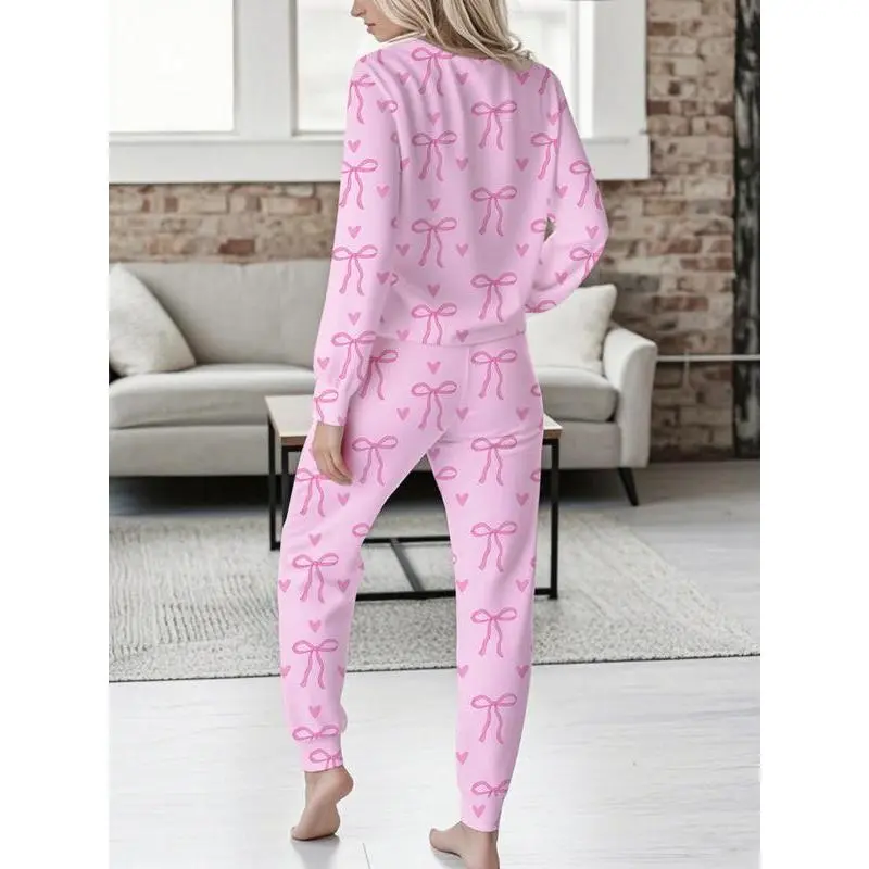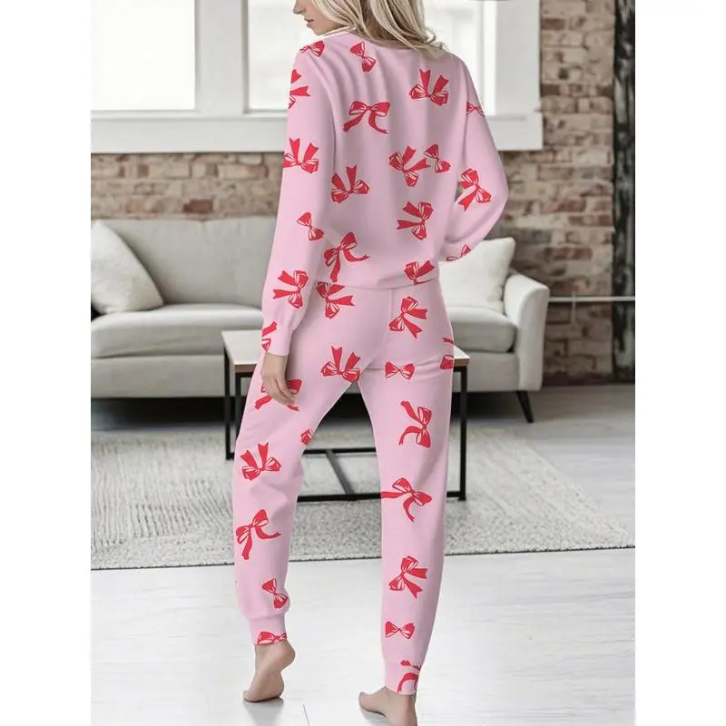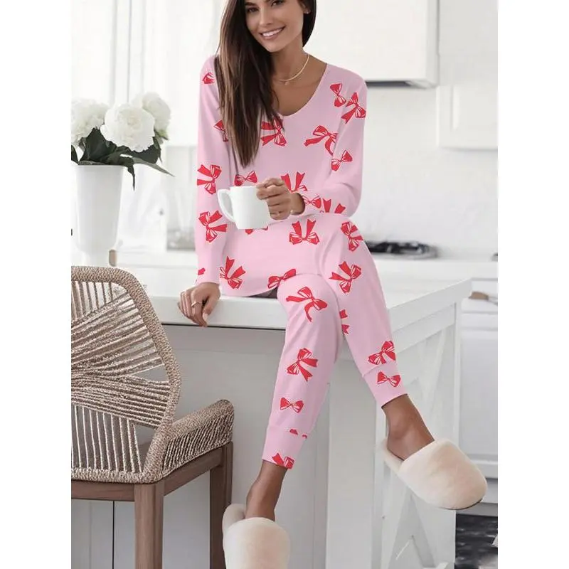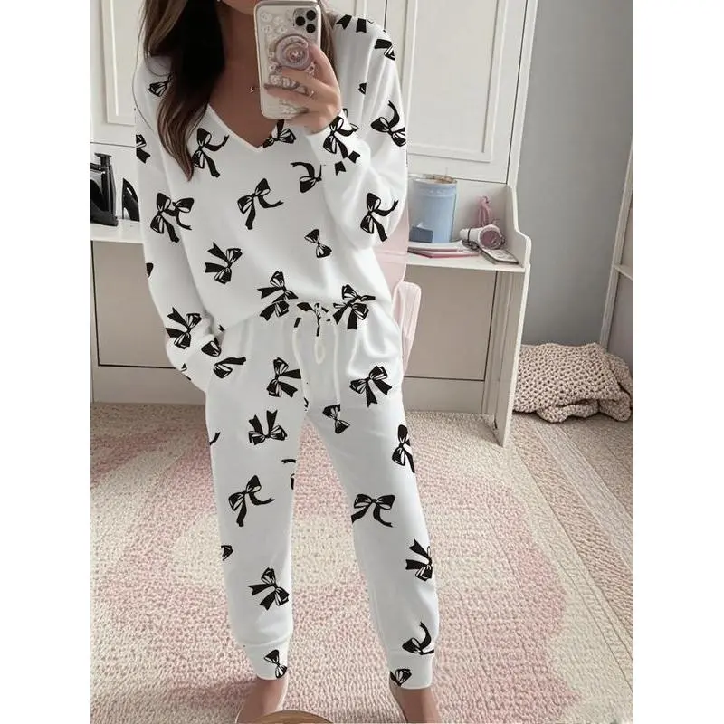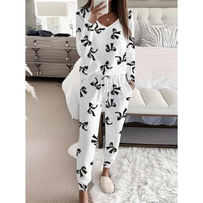 Women's Bow Print Casual Set, Long Sleeve V Neck Top & Tie Waist Pants, Ladies Homewear & Pajamas, Spring & Fall Fashion Loungewear