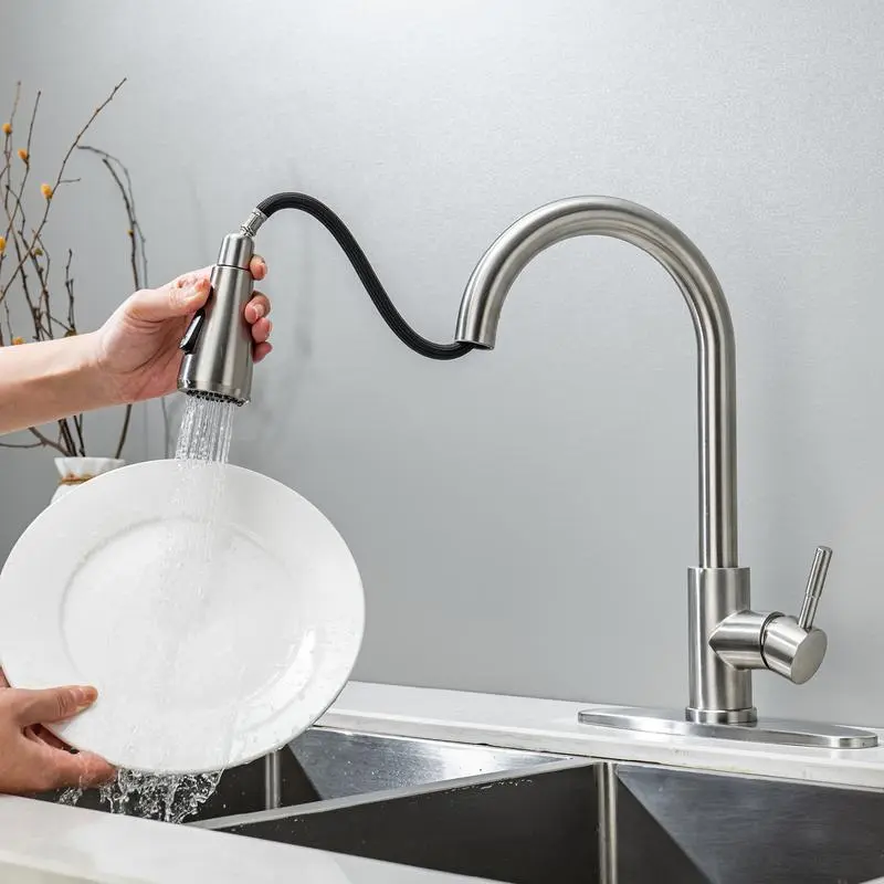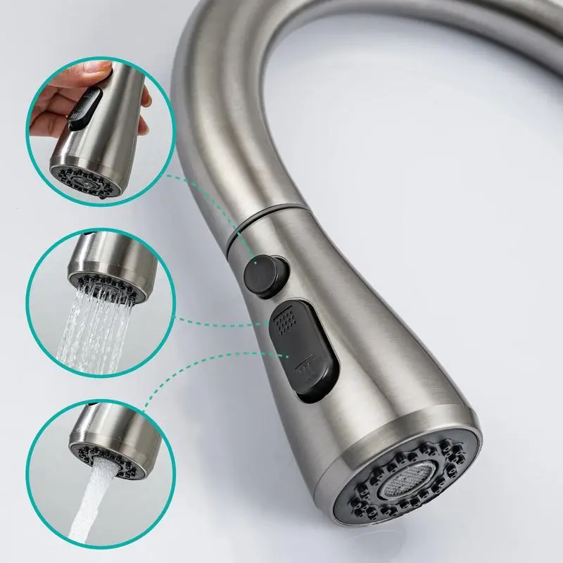 【High Arc Spout】: Features a high arc spout allowing for greater clearance and easier access to the sink for various tasks. 【Pull-Down Function】: Equipped with a pull-down spray head that enhances cleaning efficiency, making it suitable for busy kitchens. 【Durable Construction】: Constructed from stainless steel ensuring longevity and resistance to daily wear and tear for dependable use. 【Easy Installation】: Engineered for a hassle-free setup, this faucet simplifies the installation process suitable for home improvement. 【Brushed Nickel Finish】: The brushed nickel finish not only adds to its aesthetic appeal but also resists fingerprints and water spots.