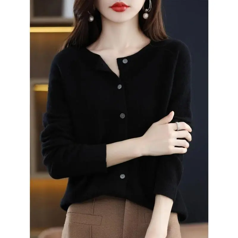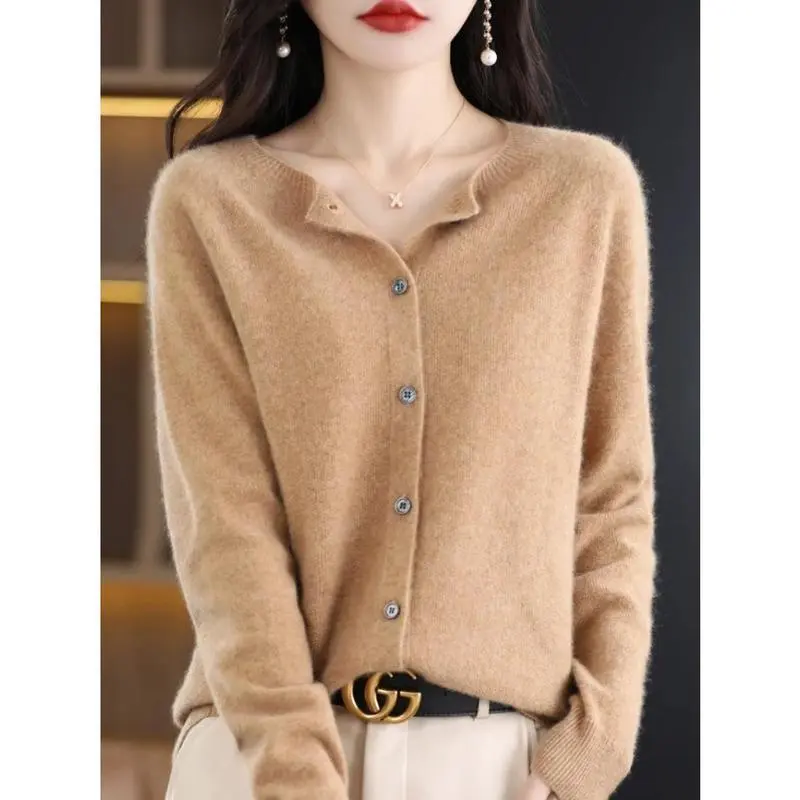 New Fashion Spring 100% Merino Wool Womens O-neck Cardigan Cashmere Sweater 2024 Female Clothing Grace Knitwear Korean Tops Womenswear Basic