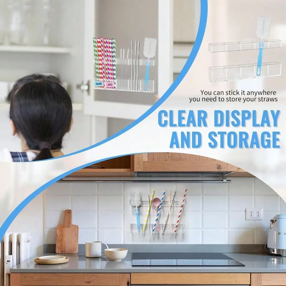 Adjustable Straw Holder For Cabinet Door - Clear Acrylic Organizer For Reusable Straws & Stirrers, Split Design Fits All Lengths, Peel & Stick Inside Cabinet Storage, Space Saving Kitchen Organization