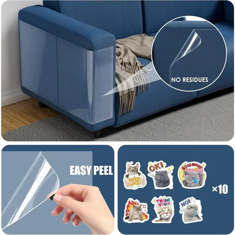 NO PINS — Fed up with harming your couch with pins?Our revolutionary Adhesive presents a fuss-free and easy method to protect your furniture.Simply peel and adhere – no Nails, no Crews, no Claws Hurt. Relish effortless, harm-free setup while preserving the integrity of your sofa! No-Trace Adhesive Protection — Experience the top of couch protection with our scratch guard. Boasting adhesive and a no-trace promise, it ensures an unyielding bond without harming your furniture. Bid farewell to shifts or slips; this guard stays put. of ? It leaves zero marks behind! A swift wipe with hot water restores your sofa's charm. Revel in superior adhesion, sans the evidence! Unrivaled Thickness for Claws — Our scratch protector boasts a robust PVC construction, engineered to endure the relentless claws. It's the unbeatable fortress your furniture deserves against potential . Invest in unparalleled, long-lasting for your beloved belongings. Vinyl for Pet-Safe — Say goodbye to unpleasant odors and rest assured knowing your pet's safety is our top priority. Plus, preserve your furniture's aesthetics with seamless transparency. Effortless Universal Furniture Protection — Not suitable for leather sofa. Universally compatible with a range of materials including cotton, , and fabric, it requires no nails or to install. Simply peel off, wipe with hot water, and witness its pristine condition .