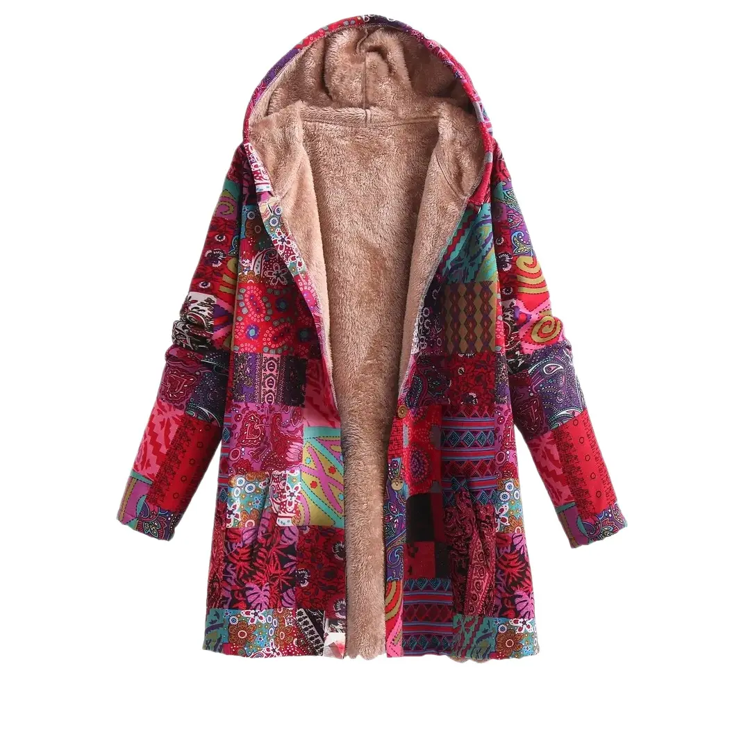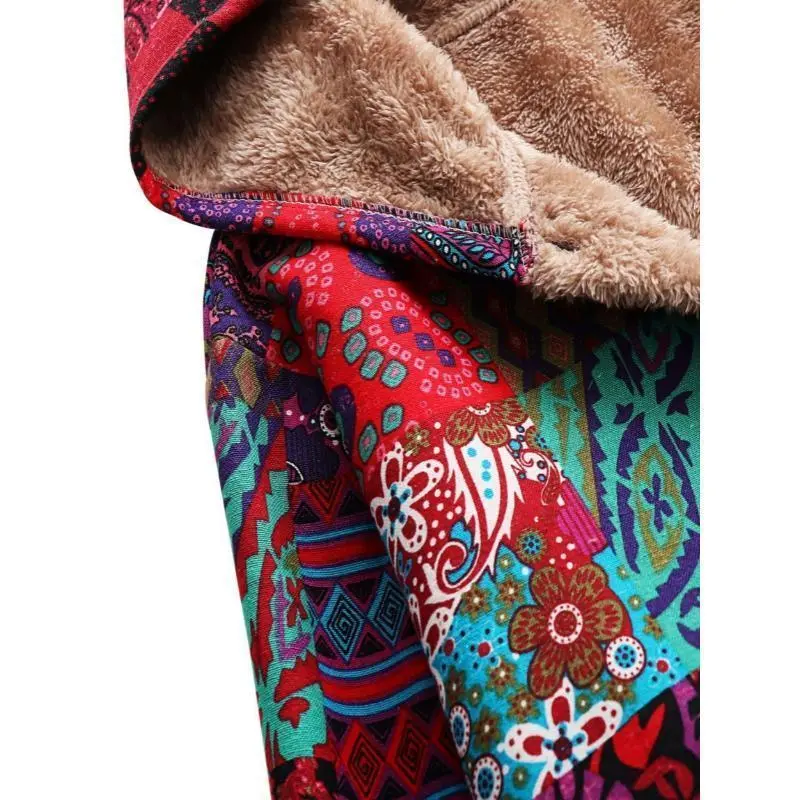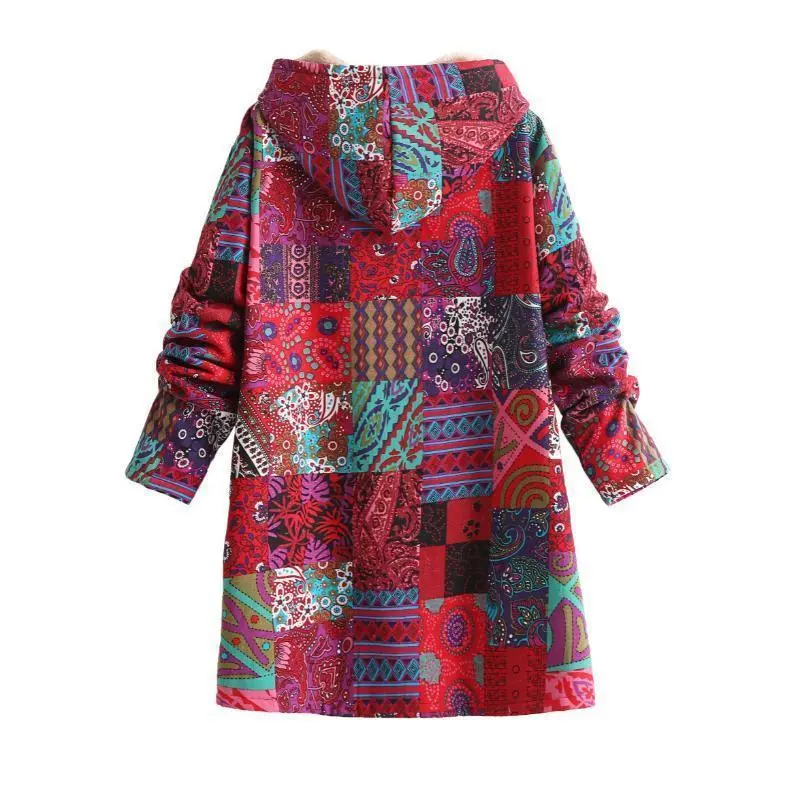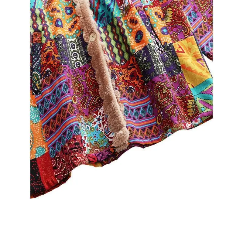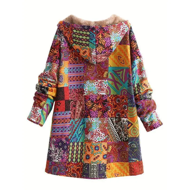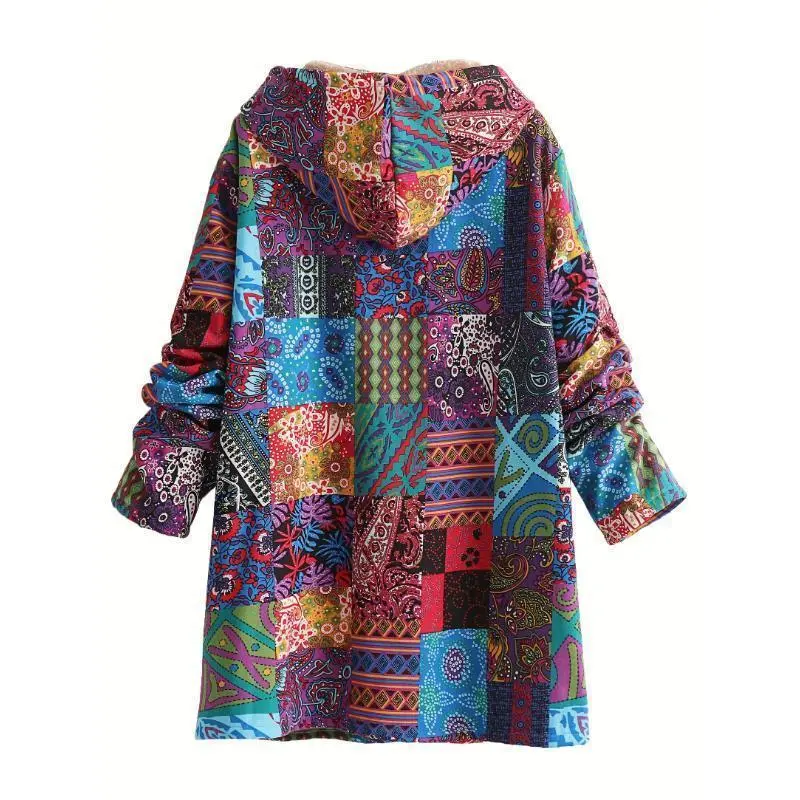 Warm Fleece-Lined Hooded Coat - Colorful Paisley & Floral Print Long Sleeve Outerwear for Women - Machine Washable, Button Front Tops Fit