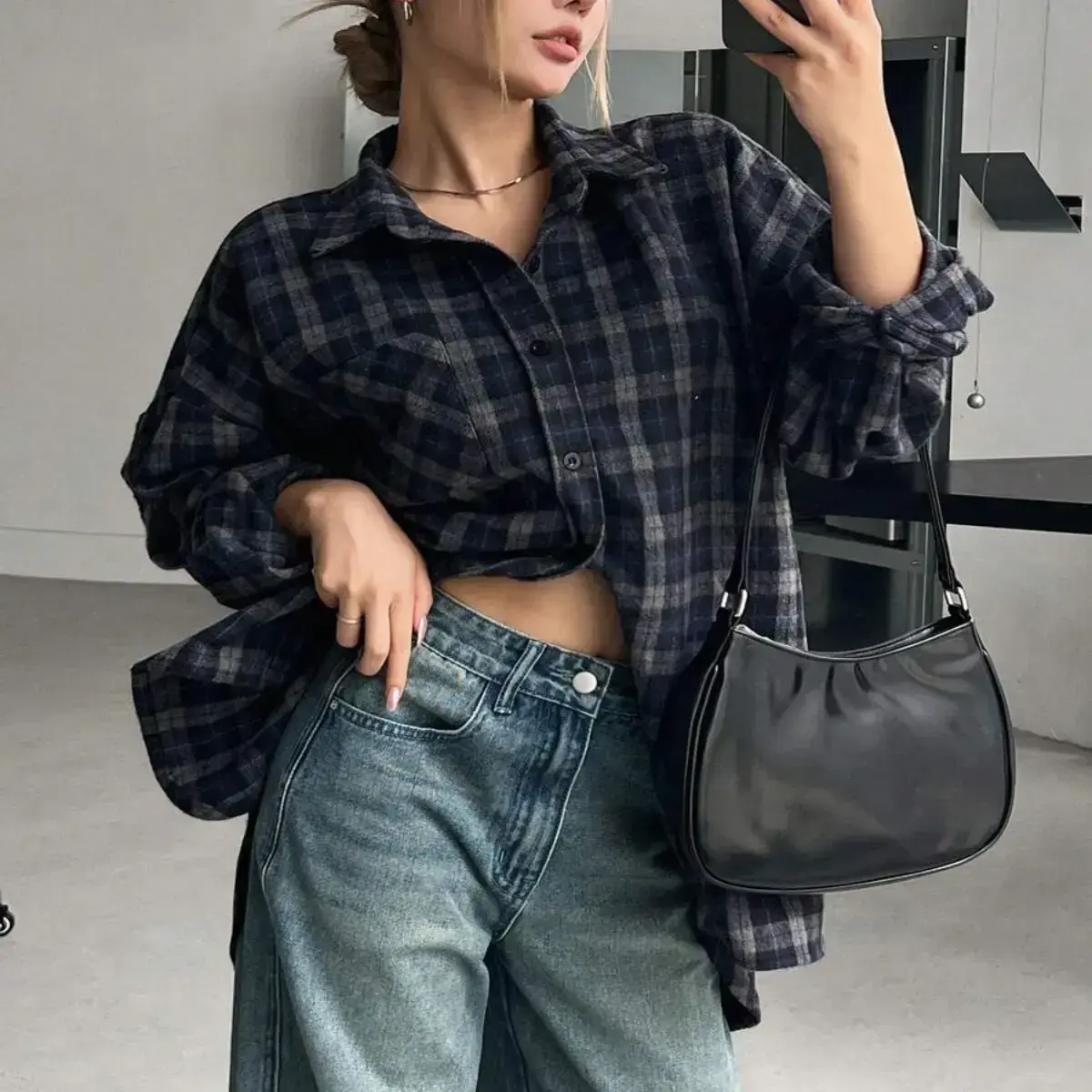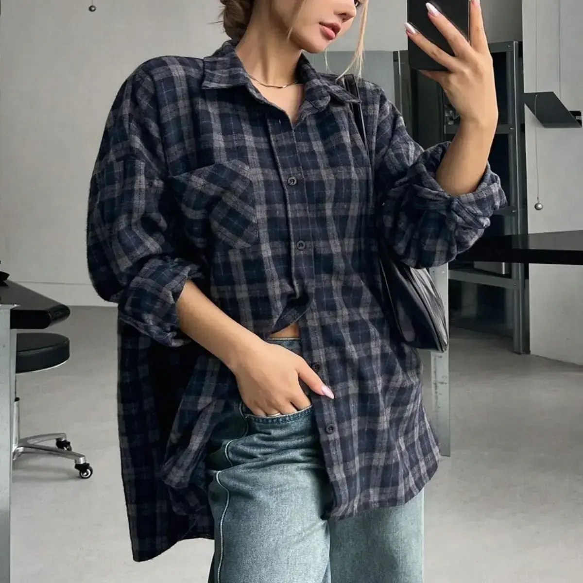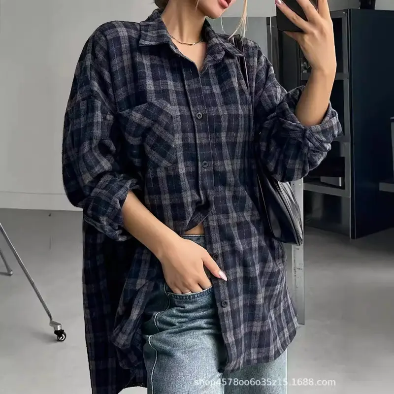 Women's Loose Plaid Street Casual School Uniform Shirt,Flannels Women Long Sleeve Blouses Fabric Top