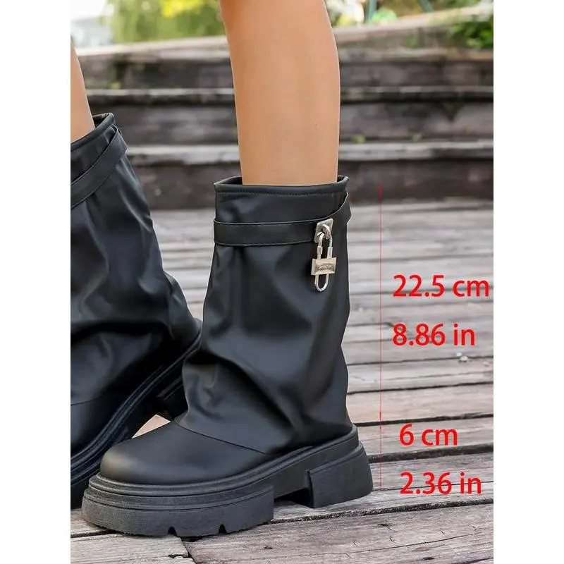 ??PU Leather Upper??: Crafted from high-quality PU leather, offering durability and a sleek, modern appearance for everyday use. ??Rubber Sole??: Features a sturdy rubber sole, providing excellent traction and support for a variety of terrains. ??Mid-Calf Height??: The mid-calf height delivers extra coverage, making it suitable for transitional seasons like spring and fall. ??Round Toe Shape??: Designed with a round toe shape, ensuring a comfortable fit that accommodates a range of foot sizes. ??Classic Buckle Detail??: Equipped with a classic buckle detail, adding a touch of uniqueness and charm to the overall look.