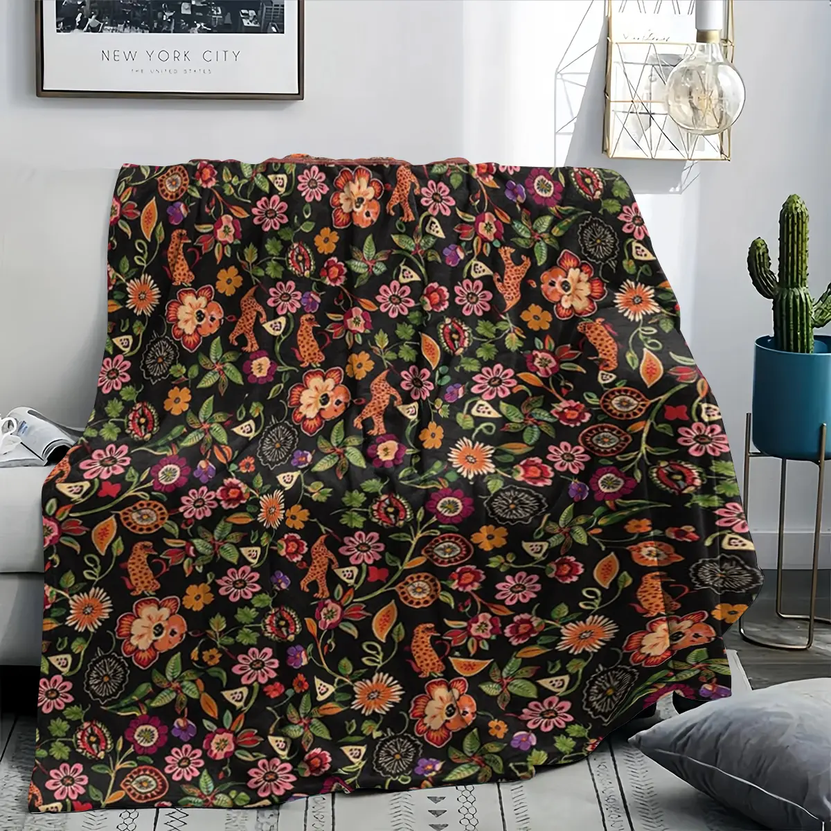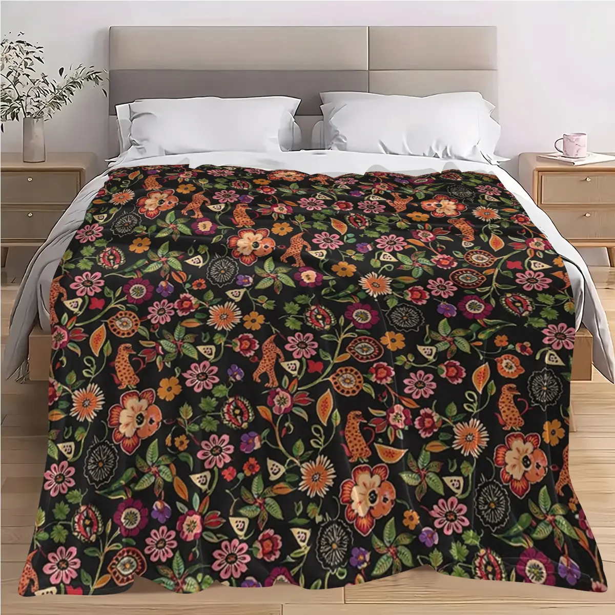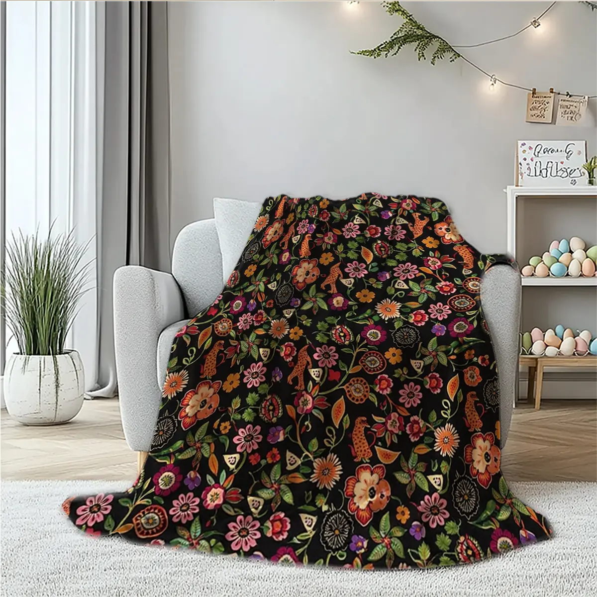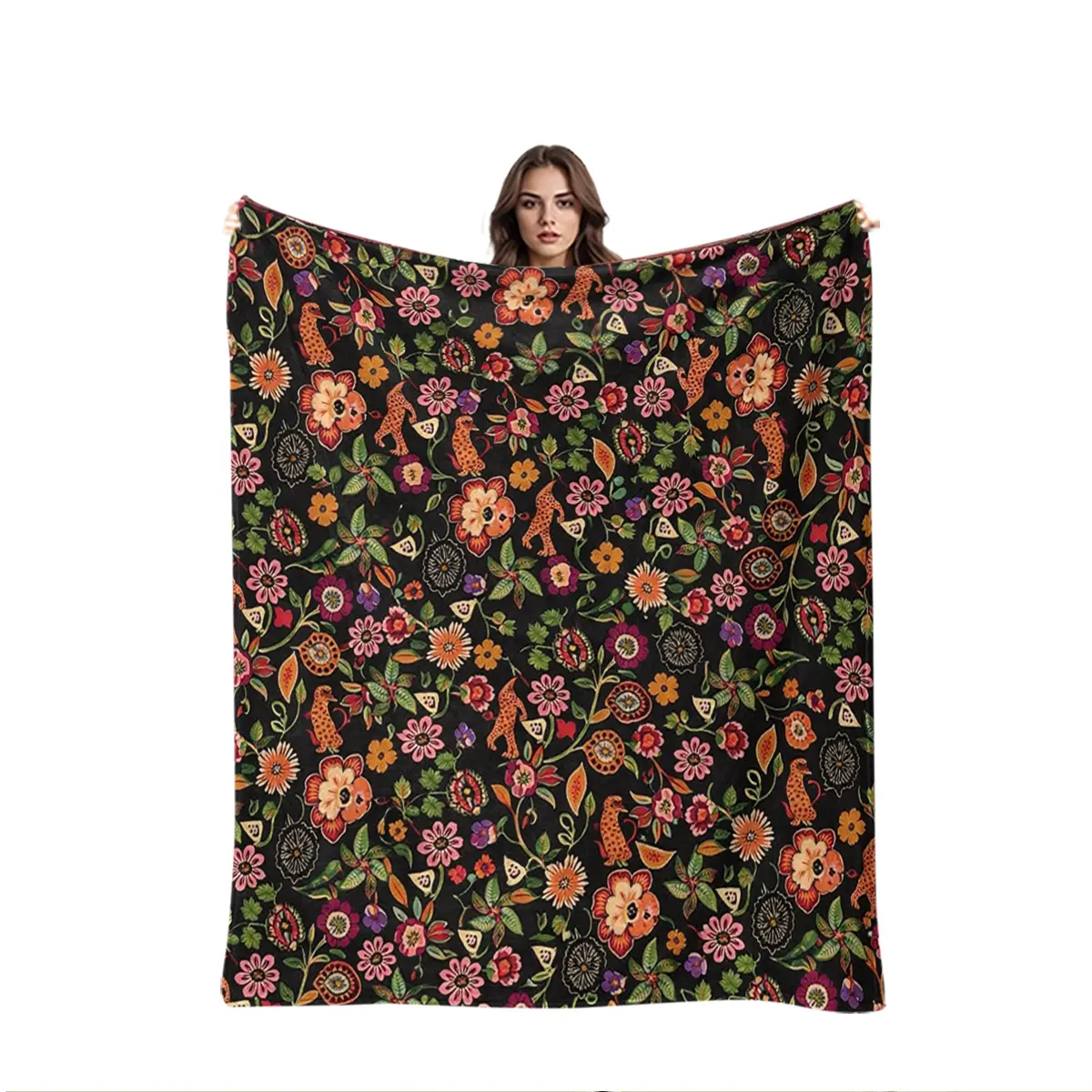 Vintage floral motif flannel blanket suitable for retro, industrial, and exotic styles in living rooms and bedrooms; can be used as a sofa throw or bedspread to elevate the space’s aesthetic. Ships from within the United States.