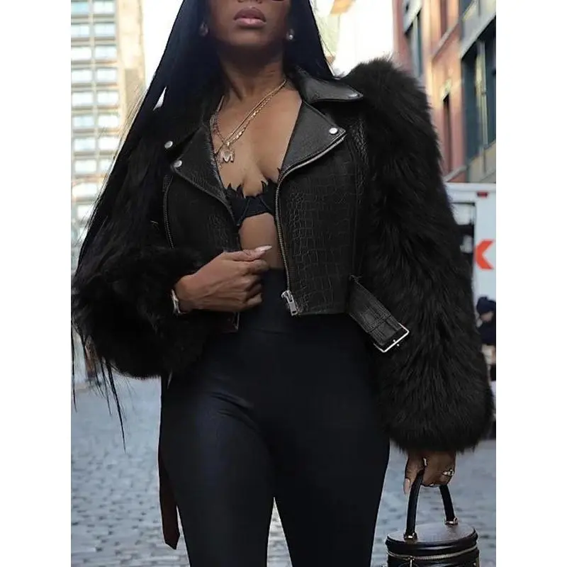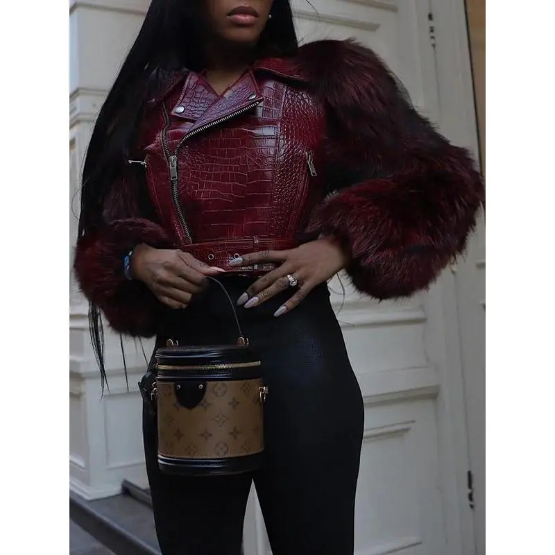??Unique Material??: Crafted with faux crocodile leather for sleeves, offering a distinct luxurious touch and visual interest. ??Zipper Closure??: Features a classic motorcycle zipper, providing practical accessibility and enhancing the jacket's edgy look. ??Collar Design??: Incorporates a stylish lapel collar, contributing to a structured finish that complements both casual and upscale outings. ??Moderate Thickness??: Made with moderate thickness fabric, suitable for wearing throughout all seasons, offering year-round adaptability. ??Tailored Fit??: Designed in a fitted silhouette that highlights the body shape while ensuring ease of movement and wearability.