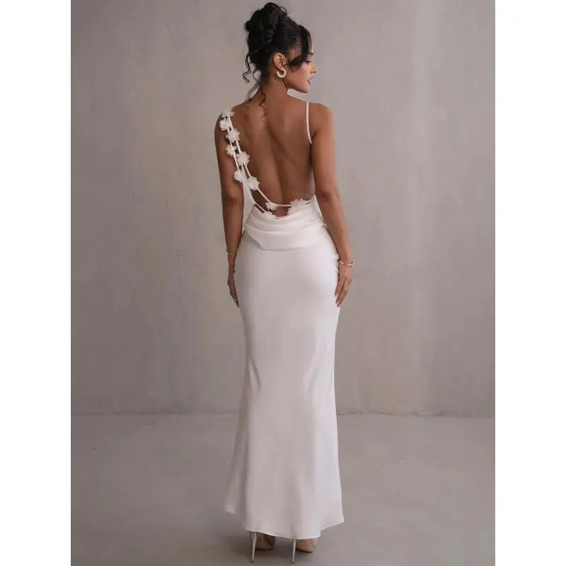 Floral Draped Backless Maxi Long Dress For Women Fashion Spaghetti Strap Sleeveless Bodycon Evening Party Dress Elegant