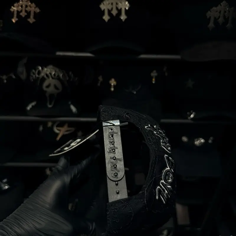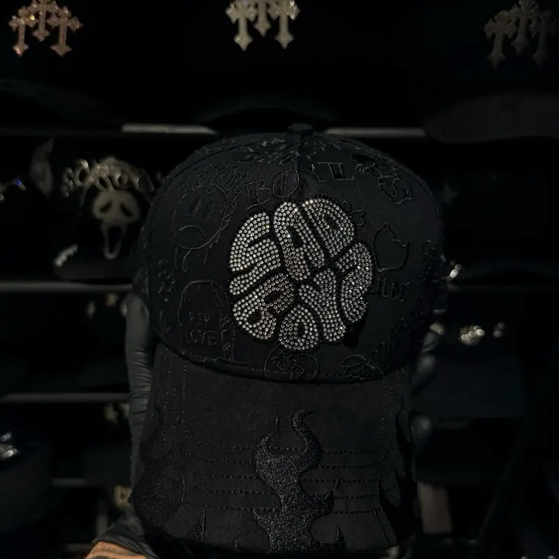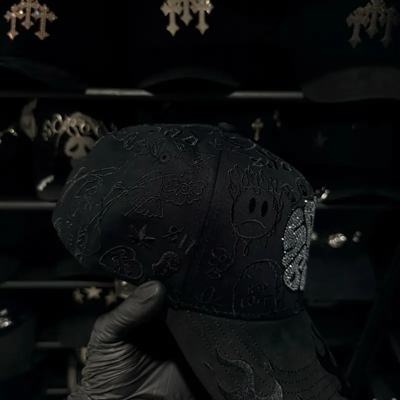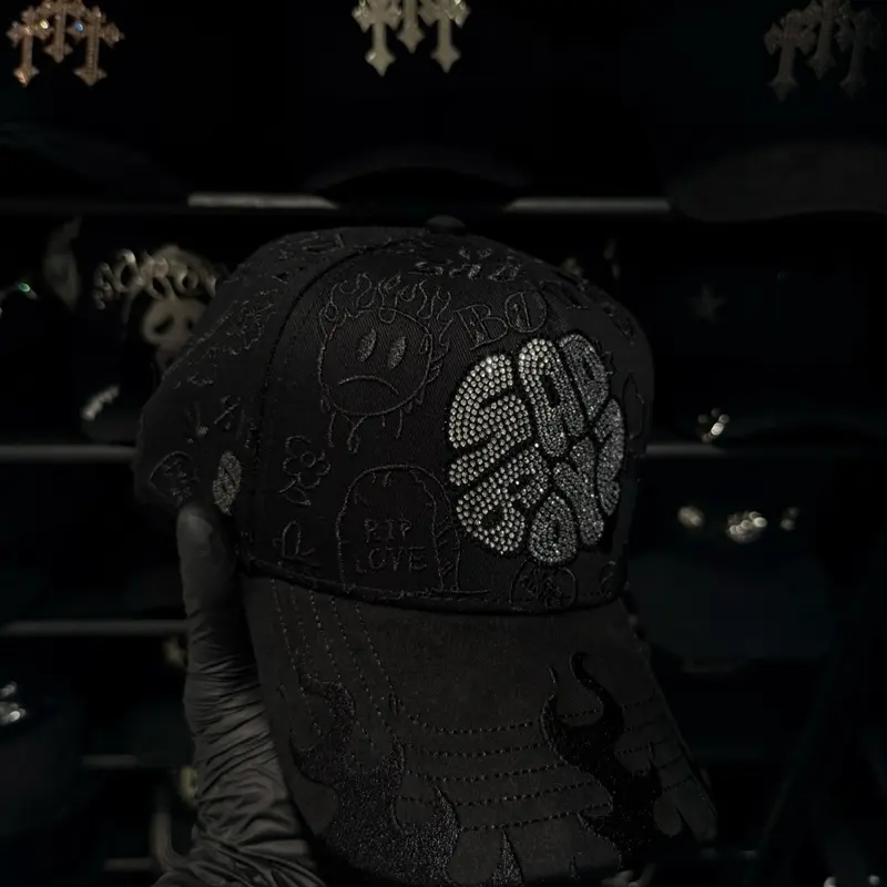 ·Key Features: Black embroidered design Rhinestone accents Unique logo detailing