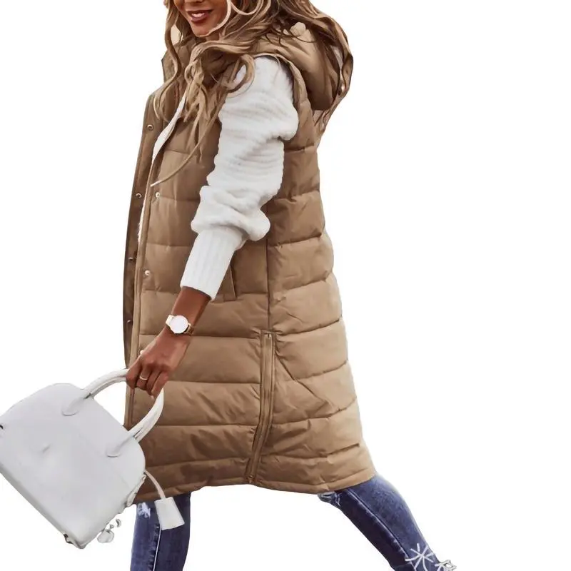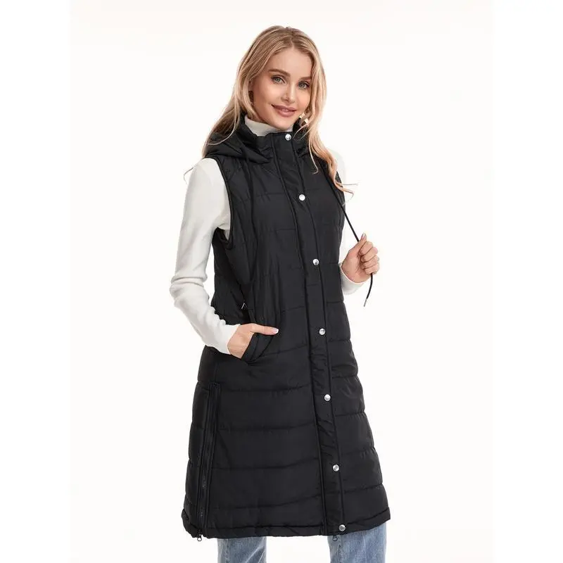 Women Warm Keeping Long Gilet Solid Colour Sleeveless Zipper Puffer Jacket Hooded Waistcoat Midi Length Down Vest Thicken Quilted Coat Padded Outwear Streets Casual Winter Womenswear E Spring Spring Tops Outerwear Fitted