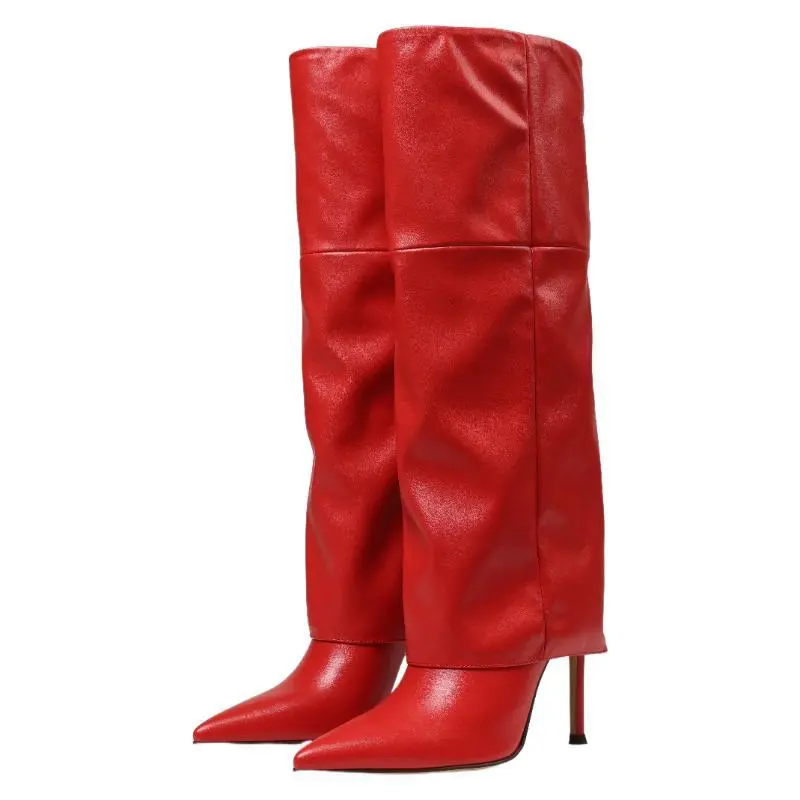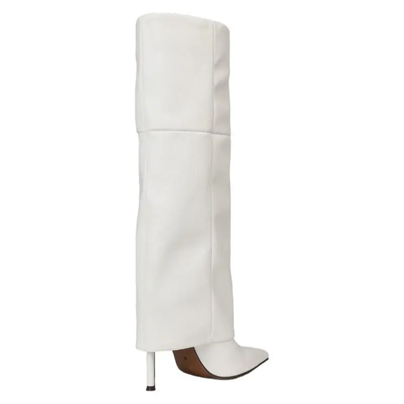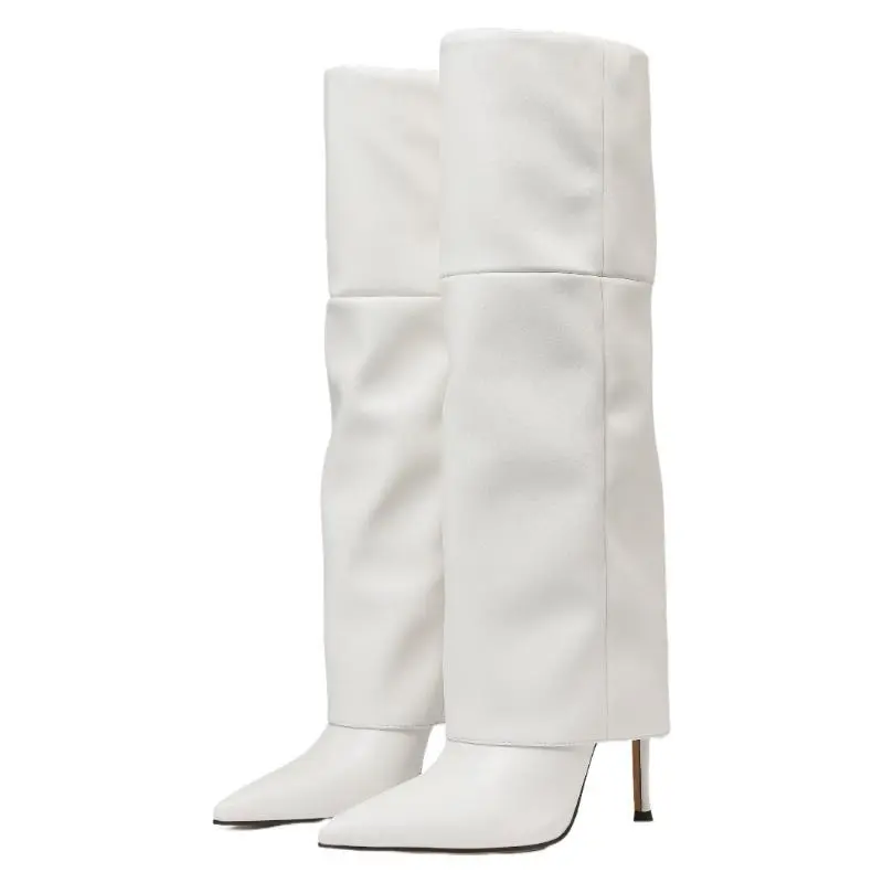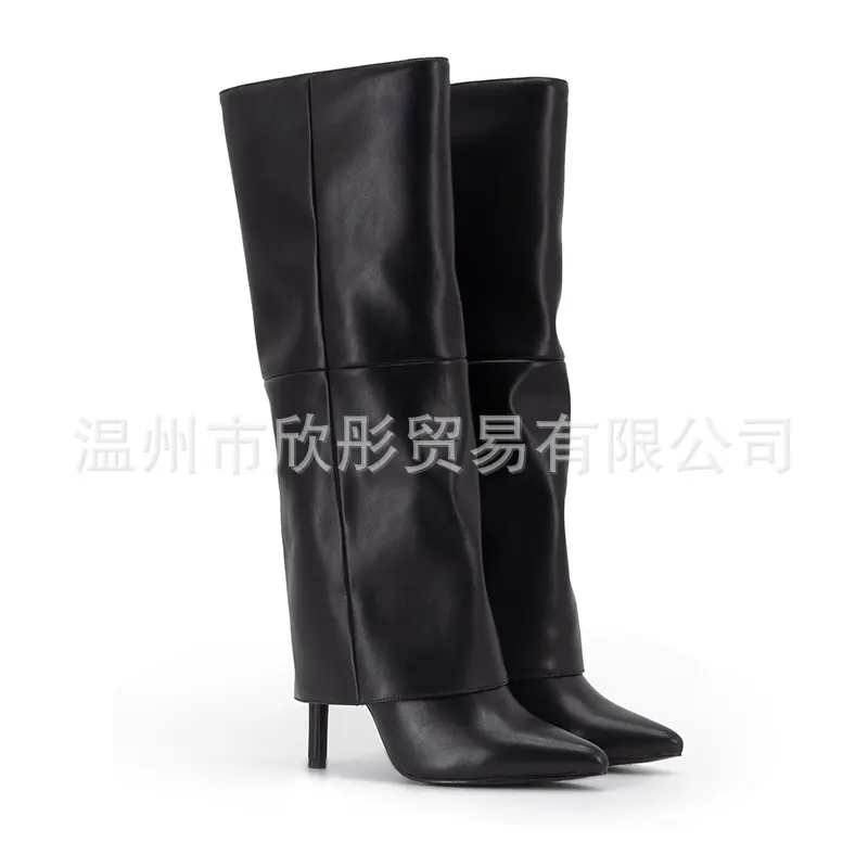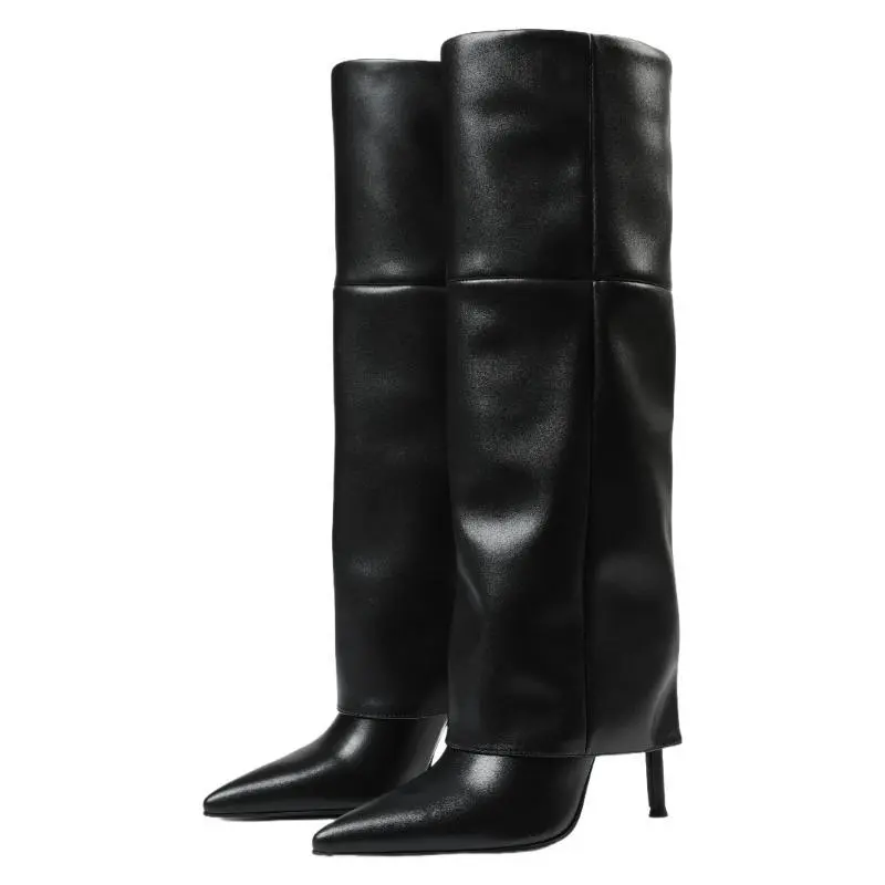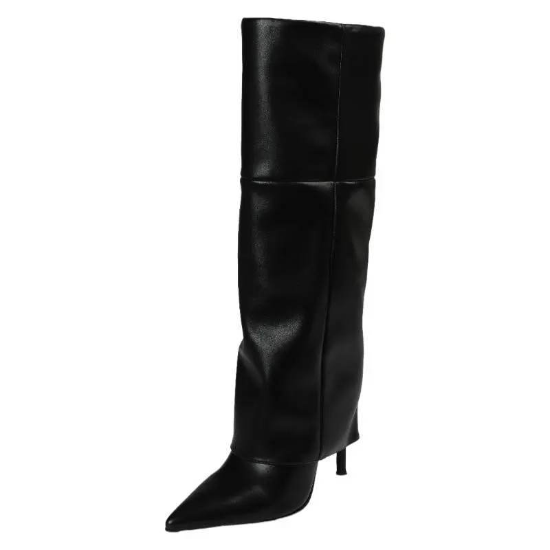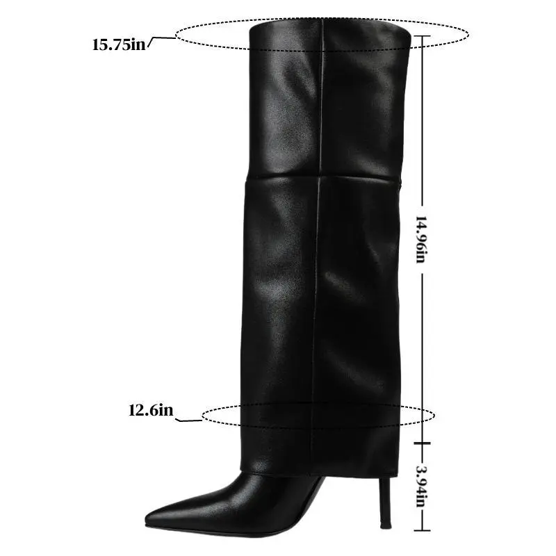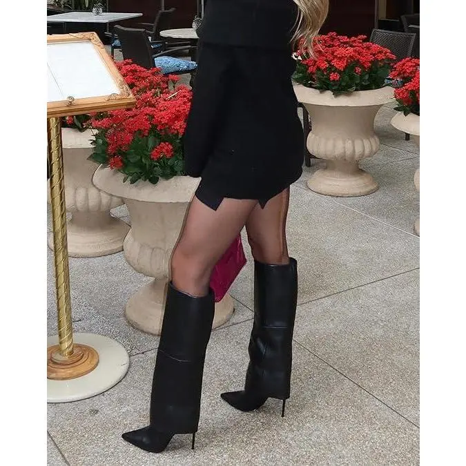 Fold Over Knee High Boots Wide Calf Pointed Toe Stiletto Heel Thigh High Boots for Women Black Walking Shoes Above The Ankle But Below The Knee