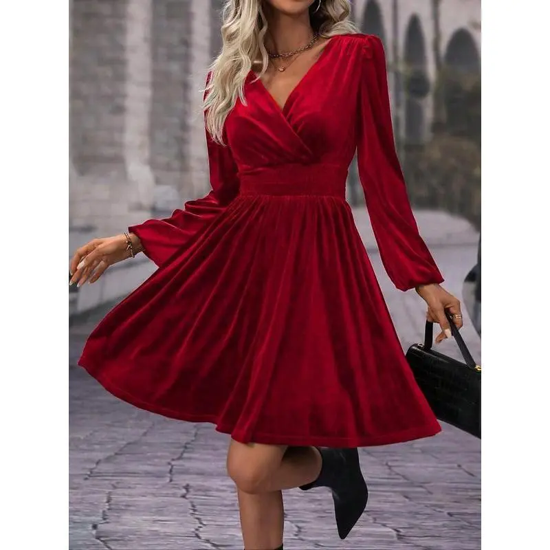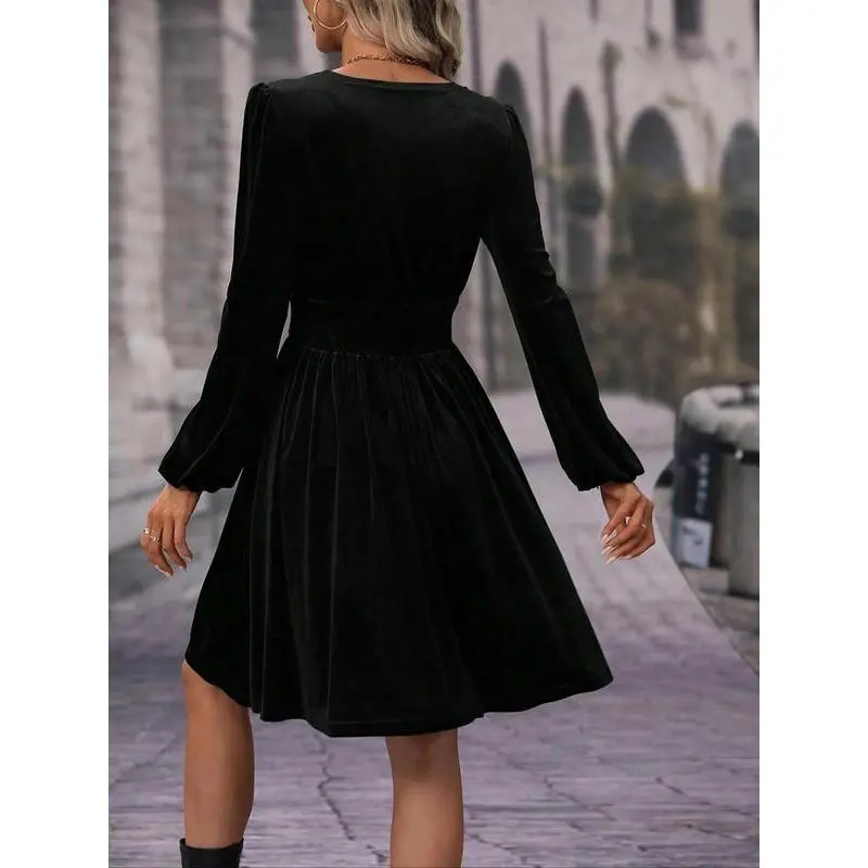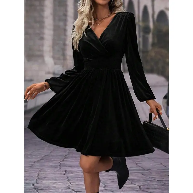 Women's Velvet Shirred V Neck A Line Dress, Elegant Bishop Sleeve Short Dress for Party Holiday Wedding Guest, Ladies Clothes for All Seasons rush taffeta auntie black