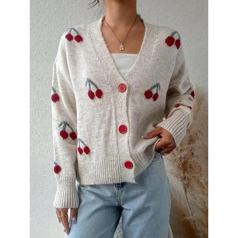 Women's Cherry Pattern Button Front Knitting Longsleeves Cardigans, Casual Elegant Long Sleeve Sweater Cardigan for Fall & Winter, Women's Knit Clothing for Daily Wear, Cardigan for Women, Women's Cardigan, Womenswear, Knitwear,Clothe Knitted Outfit Tops
