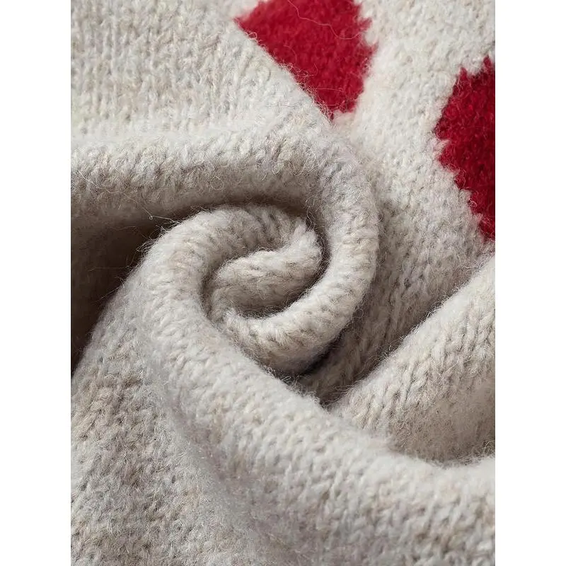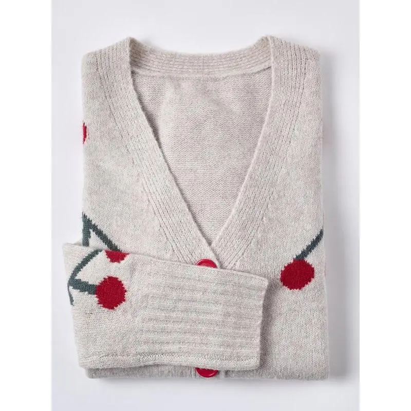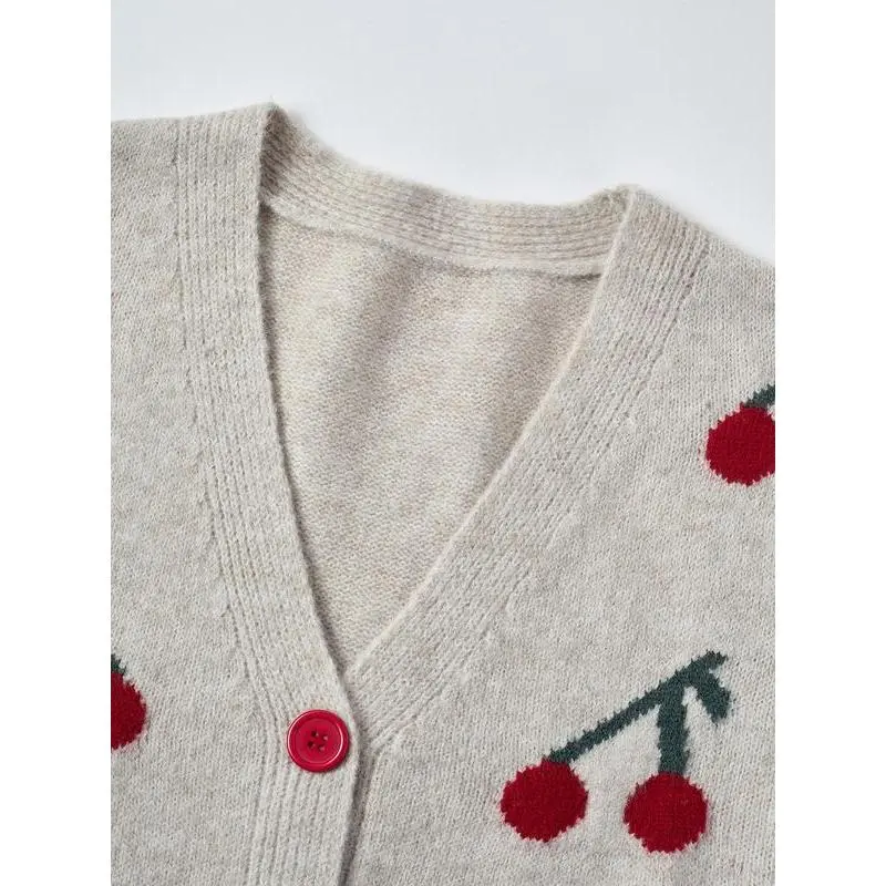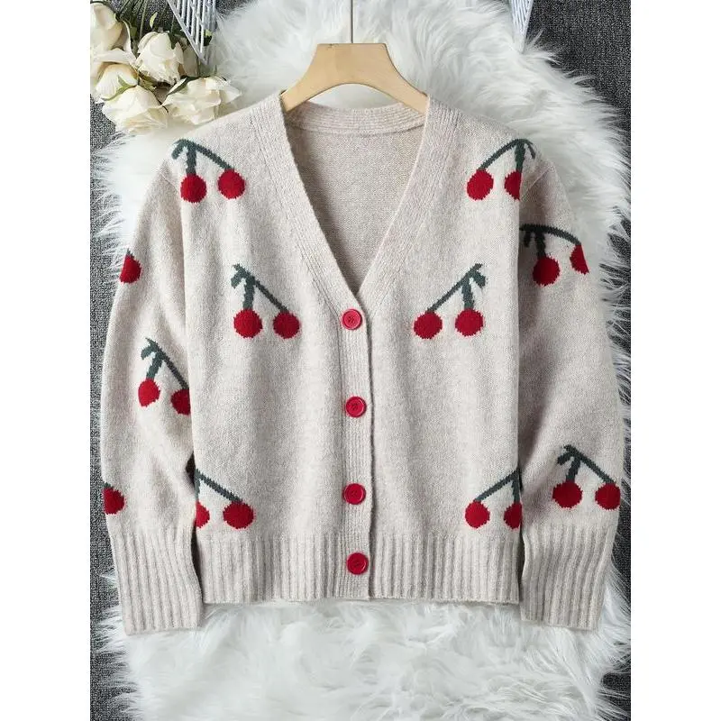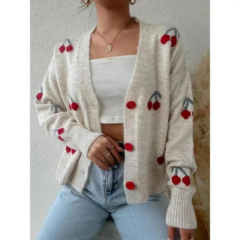 [Charming Cherry Pattern]: Featuring a unique cherry motif that adds a playful yet chic touch to your outfit for any occasion. [Long Sleeve Coverage]: Providing warmth during the chilly seasons, this piece is ideal for layering and can be effortlessly paired with various outfits. [Loose Fit]: The relaxed fit allows for ease of movement, making it perfect for daily wear while keeping you cozy and comfortable.