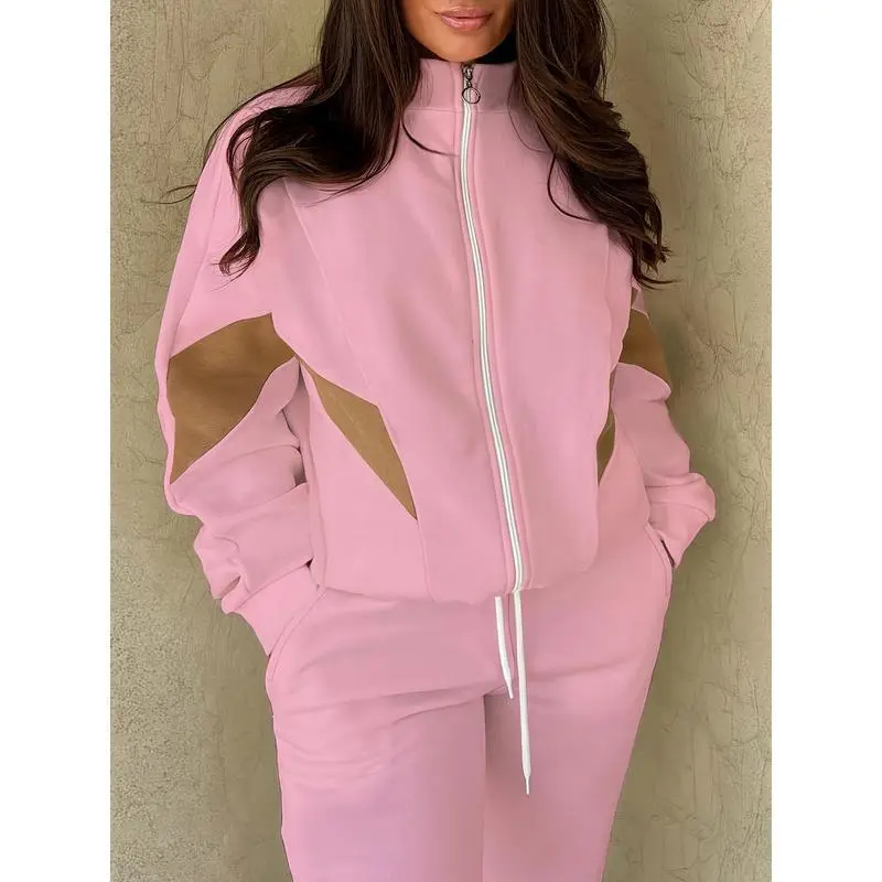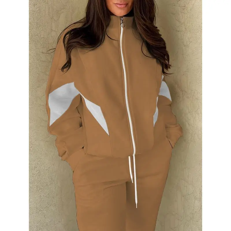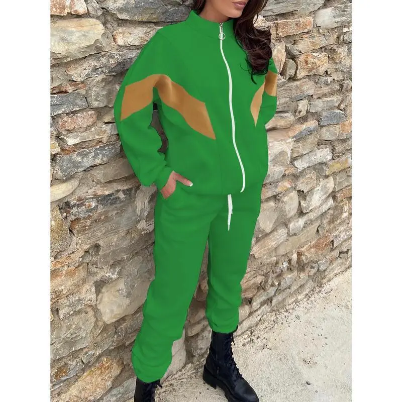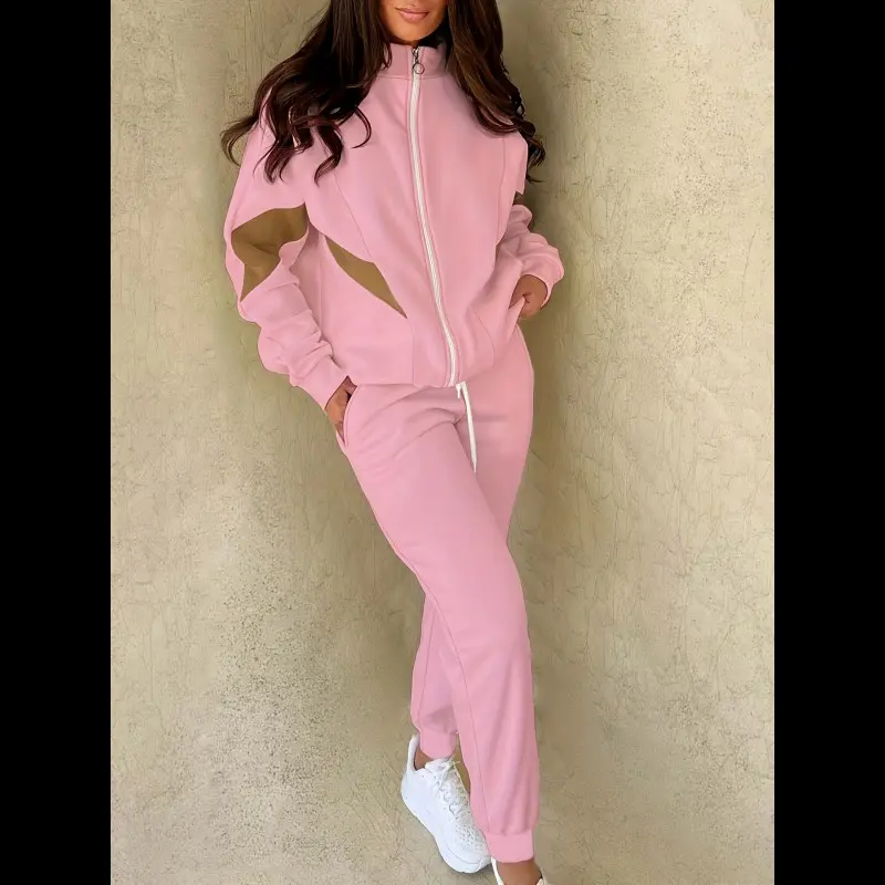 Casual Clothing Set, Women's Plus Size Color Block Long Sleeve Zipper Jacket and Drawstring Jogger Pants Set 2-Piece Set