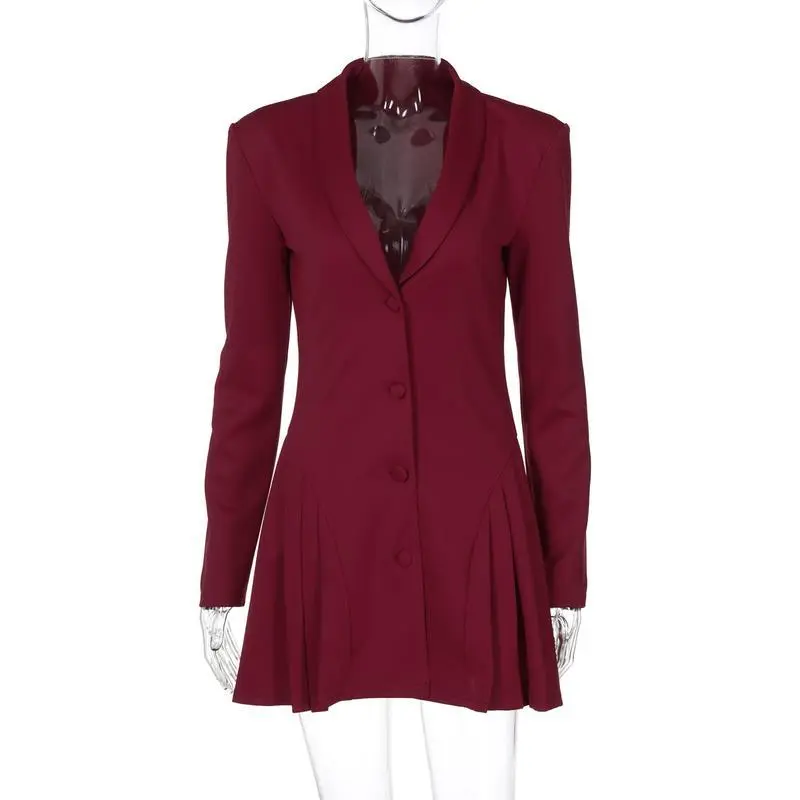 Women's Elegant Deep V-Neck Long Sleeve Button Pleated Mini Blazer Dress