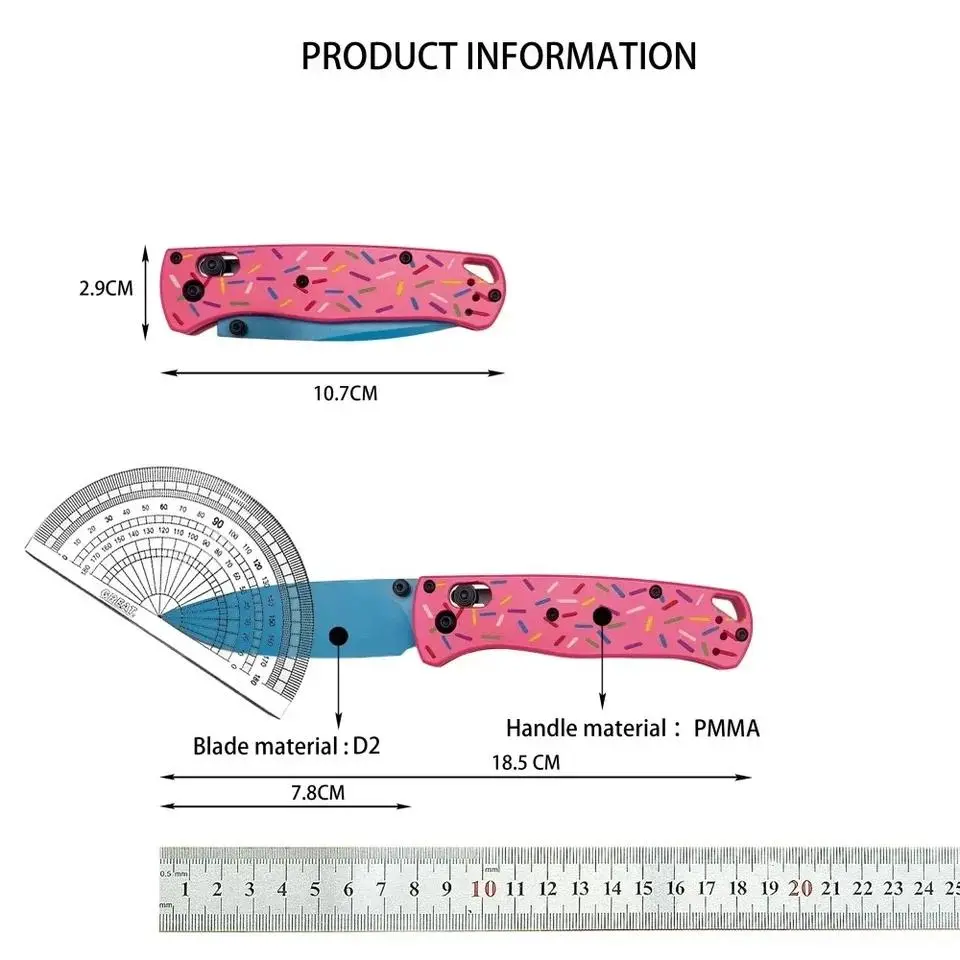 The BM Bugout 535 Donut Pink Handle Knife is a manual open pocket folding knife.It features a total length of 18.5 CM, with a handle length of 10.7 CM and a blade length of 7.8 CM.The blade width is 2.4 CM, and the blade thickness is 2 MM.Made from D2 material, it weighs 64G.The acrylic handle is 2.7 CM wide and 1..1 CM thick.