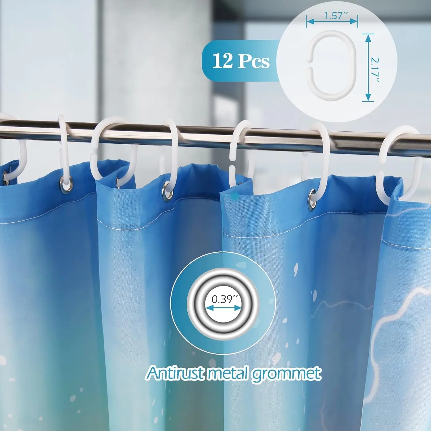 The Package also includes 12 free hooks, allow you to easily install curtain with shower hooks.