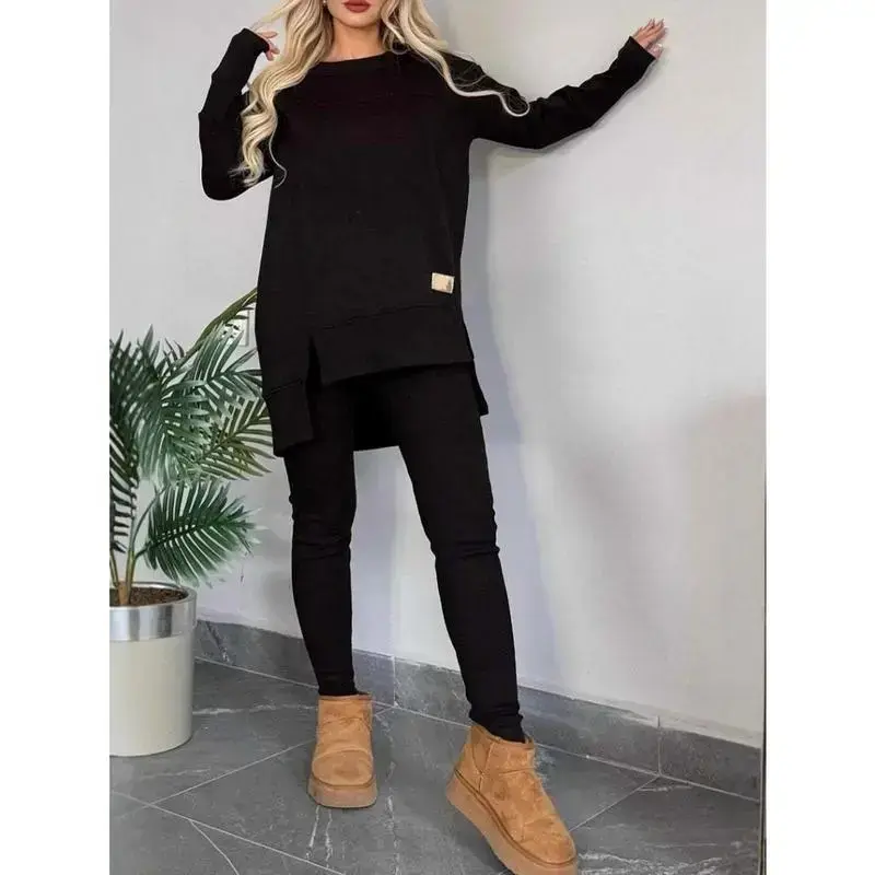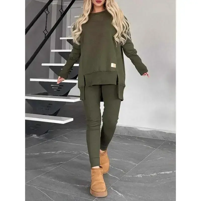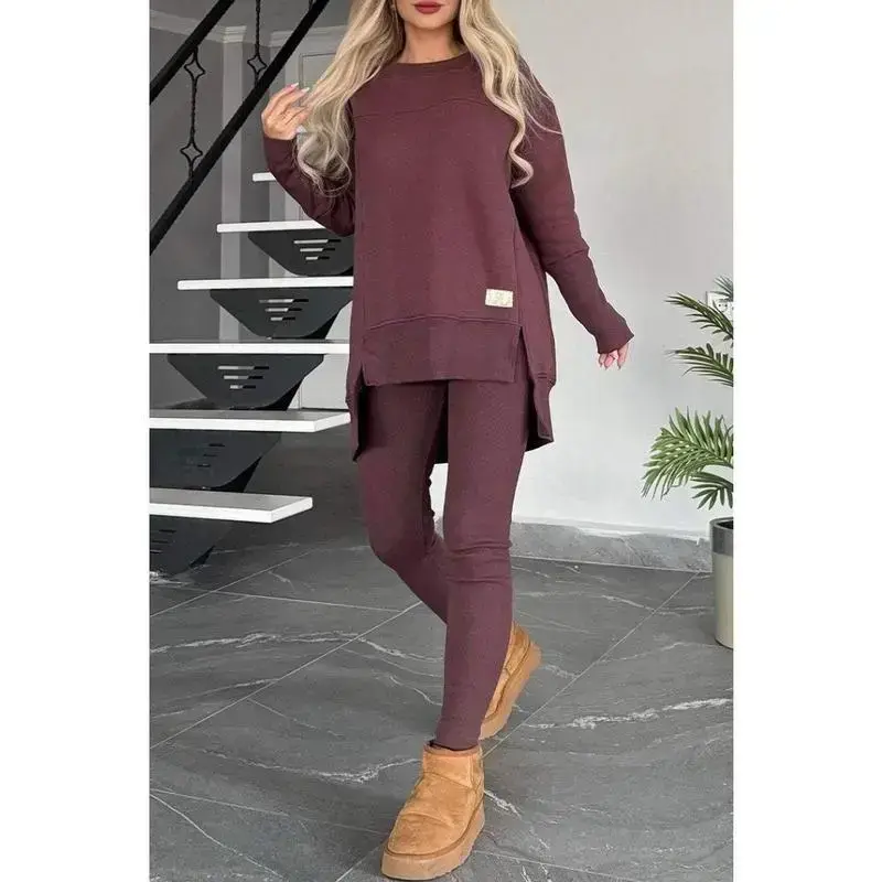 Cross Border Fall/Winter-Selling Women's Top Slit Long Sleeve Crew Neck Casual Solid Color Velvet Suit Womenswear Clothes