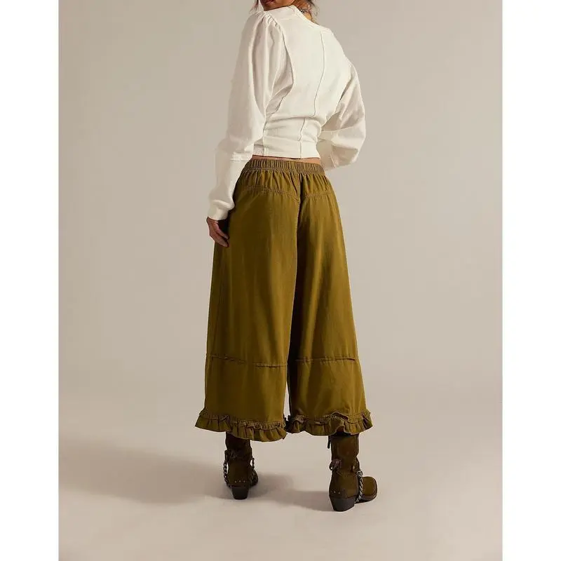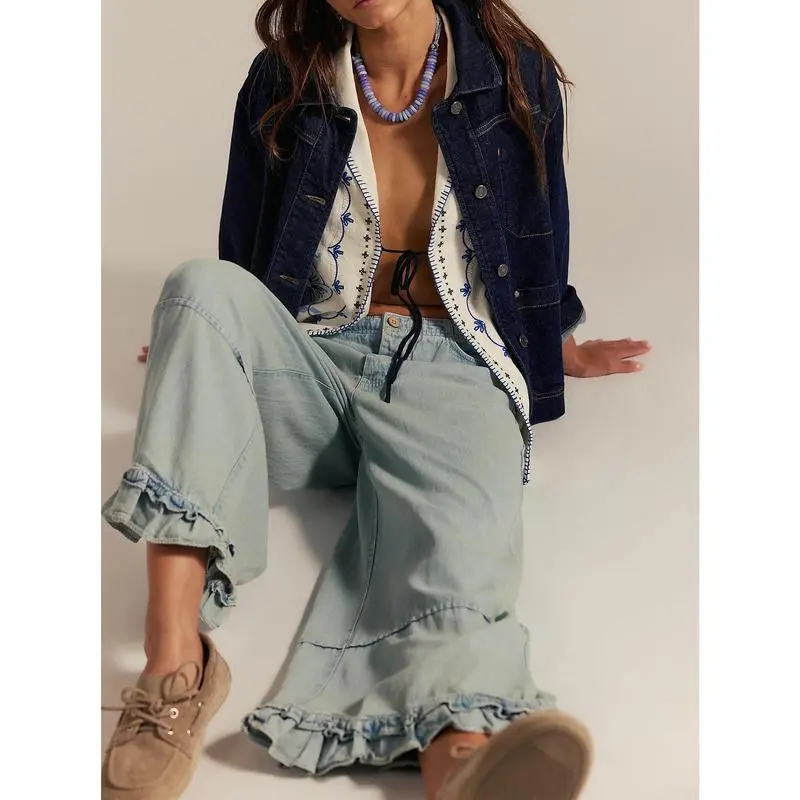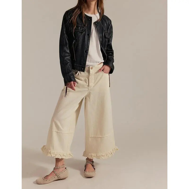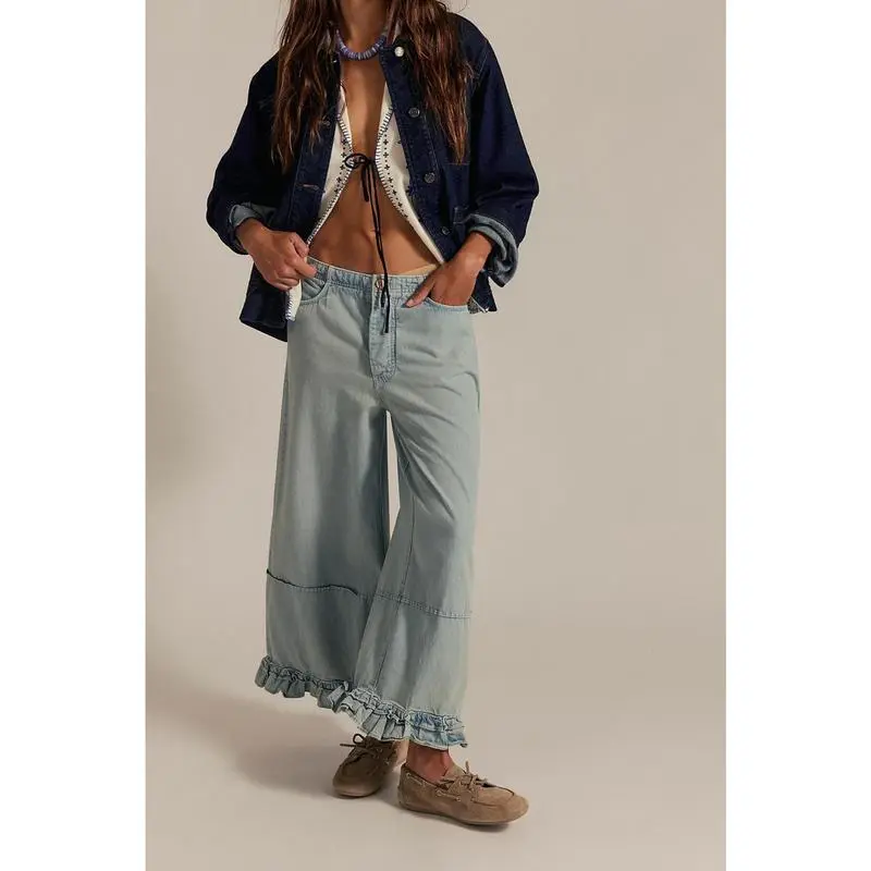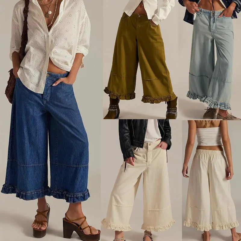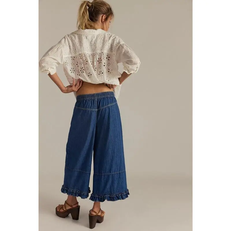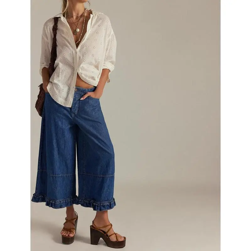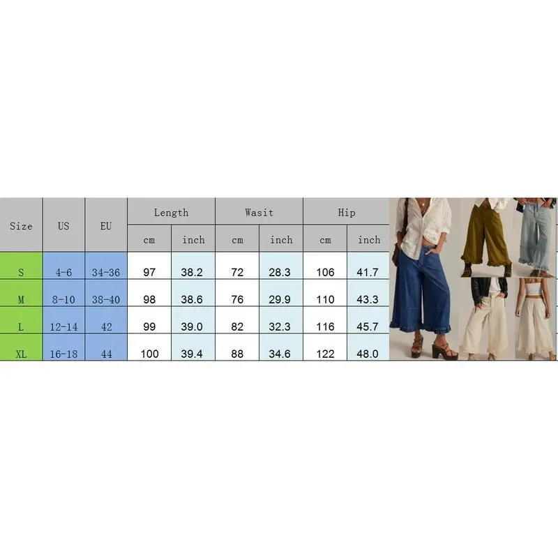 Wide Leg Denim Culottes for Women High Waist Ruffled Hem Cropped Pants Comfortable Summer Casual Loose Fit Fashionable Wide Leg Denim Pants for Women Size (cm):