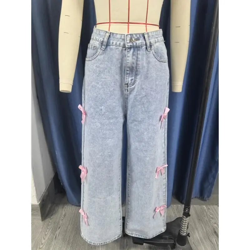 Women's Elastic Wide Leg Jeans Women Jeans Wide Leg Pants Bow Washed High Waist 2025 Streetwear Denims Distressed Vintage Straight Ankle Length Trousers