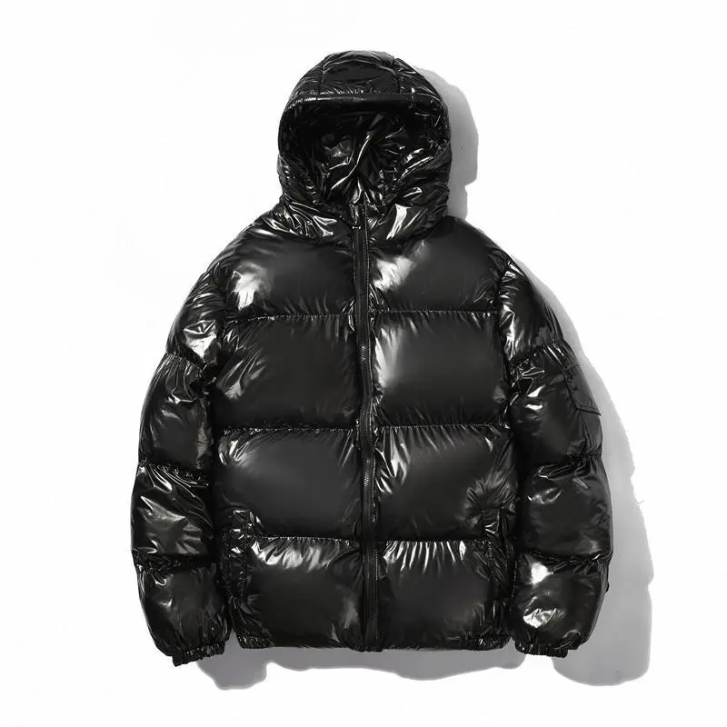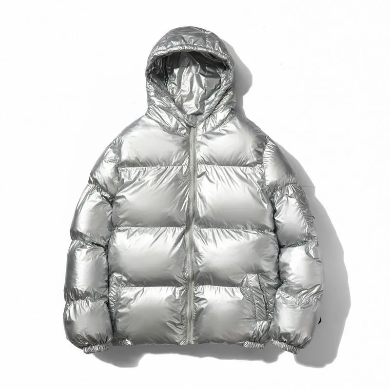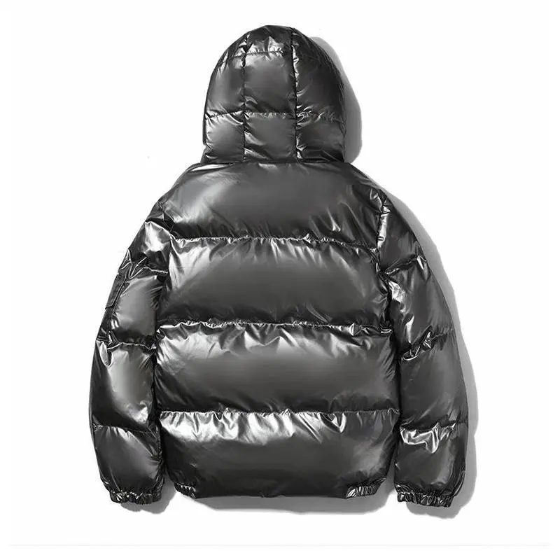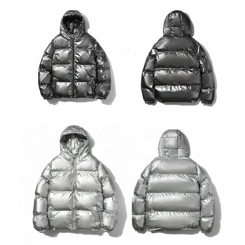 Mens Shiny Puffer Jacket Zip Up Hooded Coat Thick Cotton Padded Outerwear Warm Winter Streetwear Fashion Casual Loose Fit Clean Look Windproof Thermal Jacket With Side Pockets Stylish Minimalist Design For Cold Weather Comfort