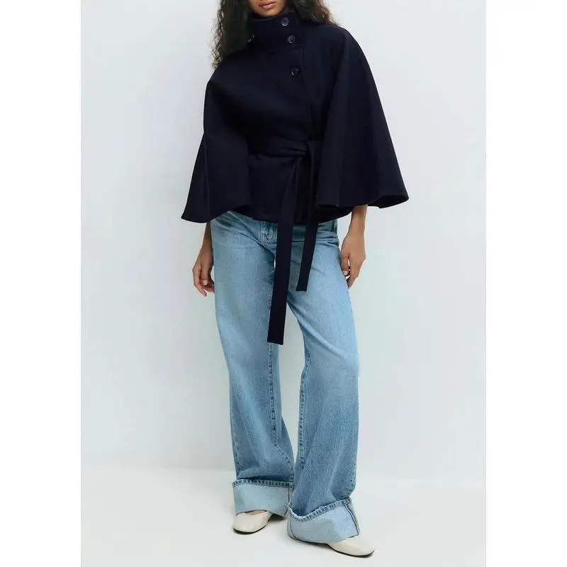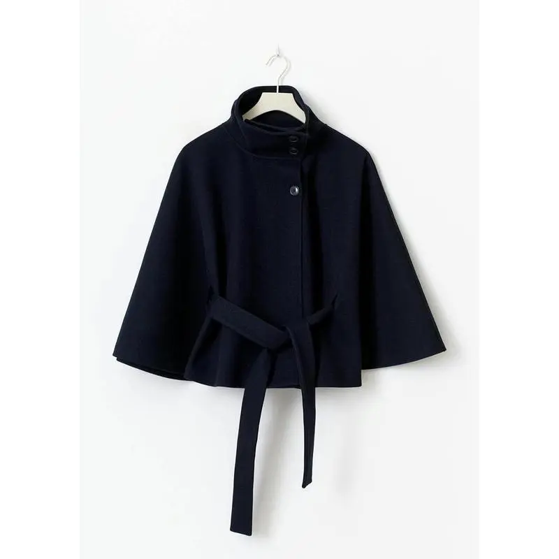 Women Batwing Sleeve Ponchos Pea Coat Wool Stand Collar Belt Capes Jacket Winter Cropped Overcoat